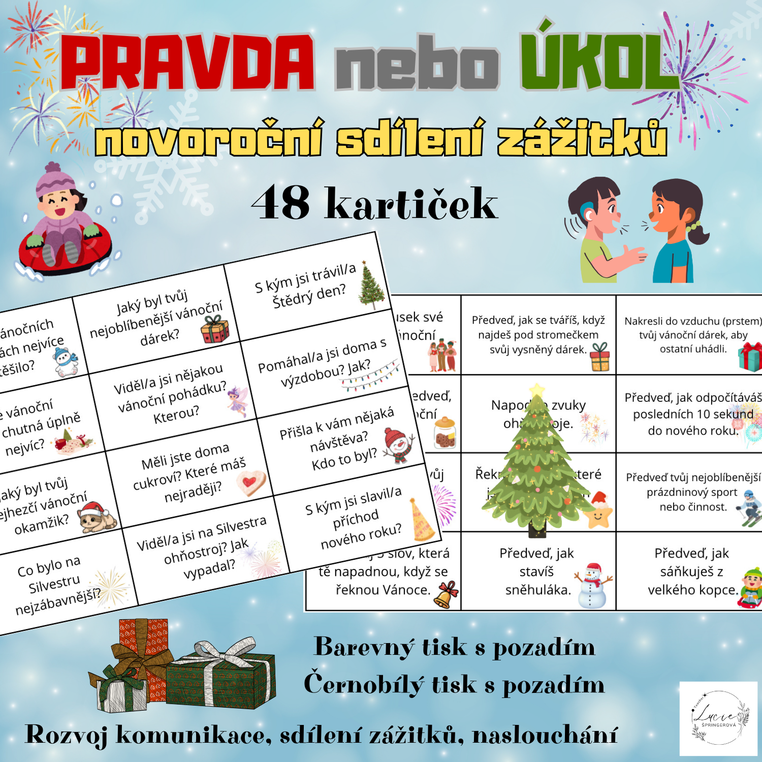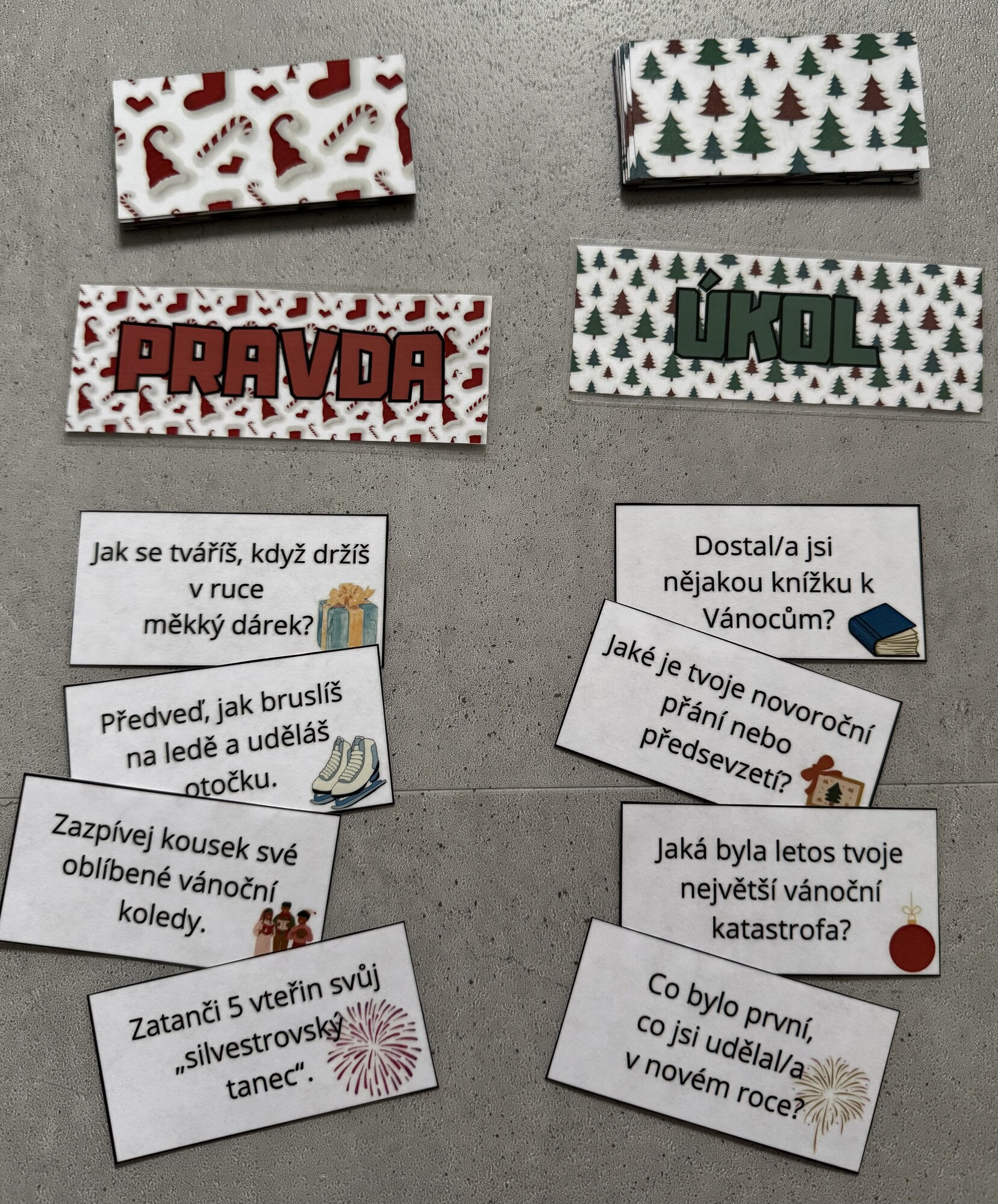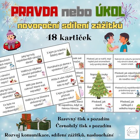 - Při oboustranném tisku od strany 2-17 získáte pozadí a rozpoznáte kartičky pravdy (pozadí stromečky) od úkolu (pozadí punčochy a čepičky).