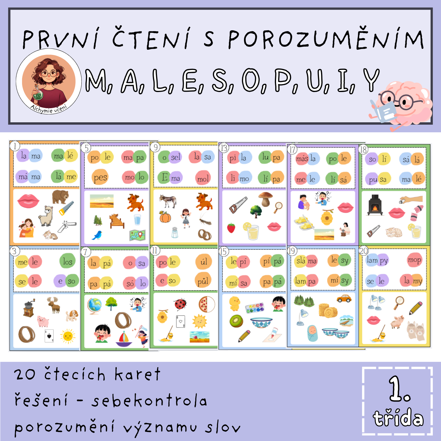 - rozpoznávání a čtení slov z písmen M, A, L, E, S, O, P, U, I, Y