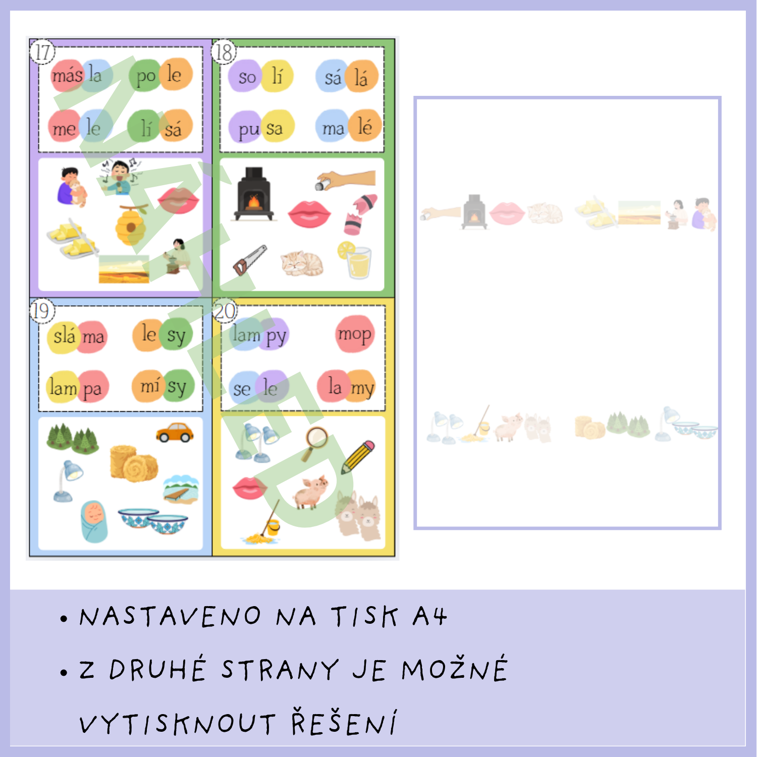 - 20 čtecích karet k procvičení slabik a jednoduchých slov,