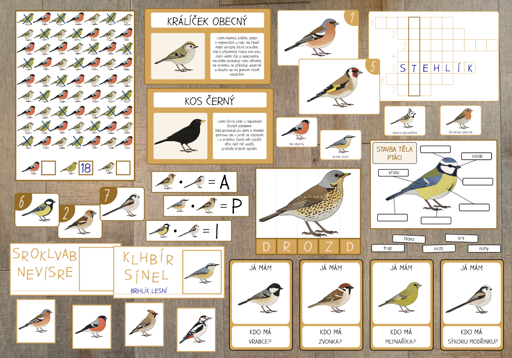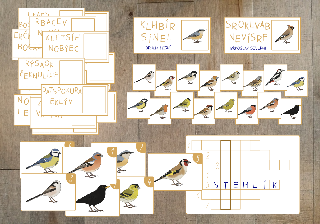 Přesmyčky - Cílem je složit z písmen název ptáka a doplnit správný obrázek.
