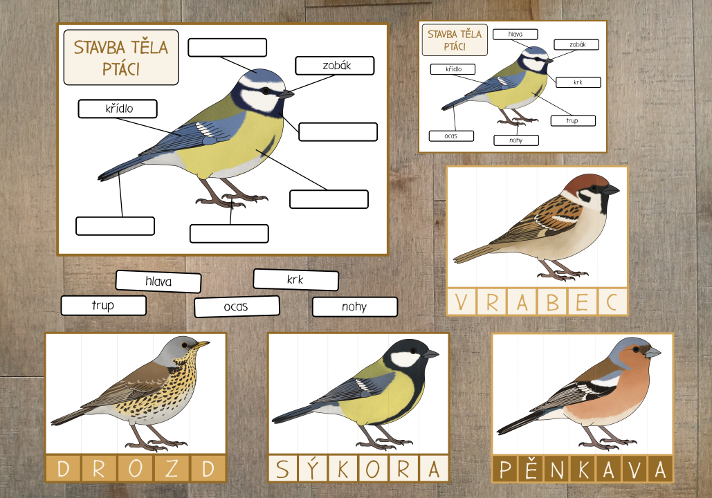 Skládačka - Obsahem jsou 4 obrázky rozdělené na části. Úkolem je složit obrázek a název ptáka.