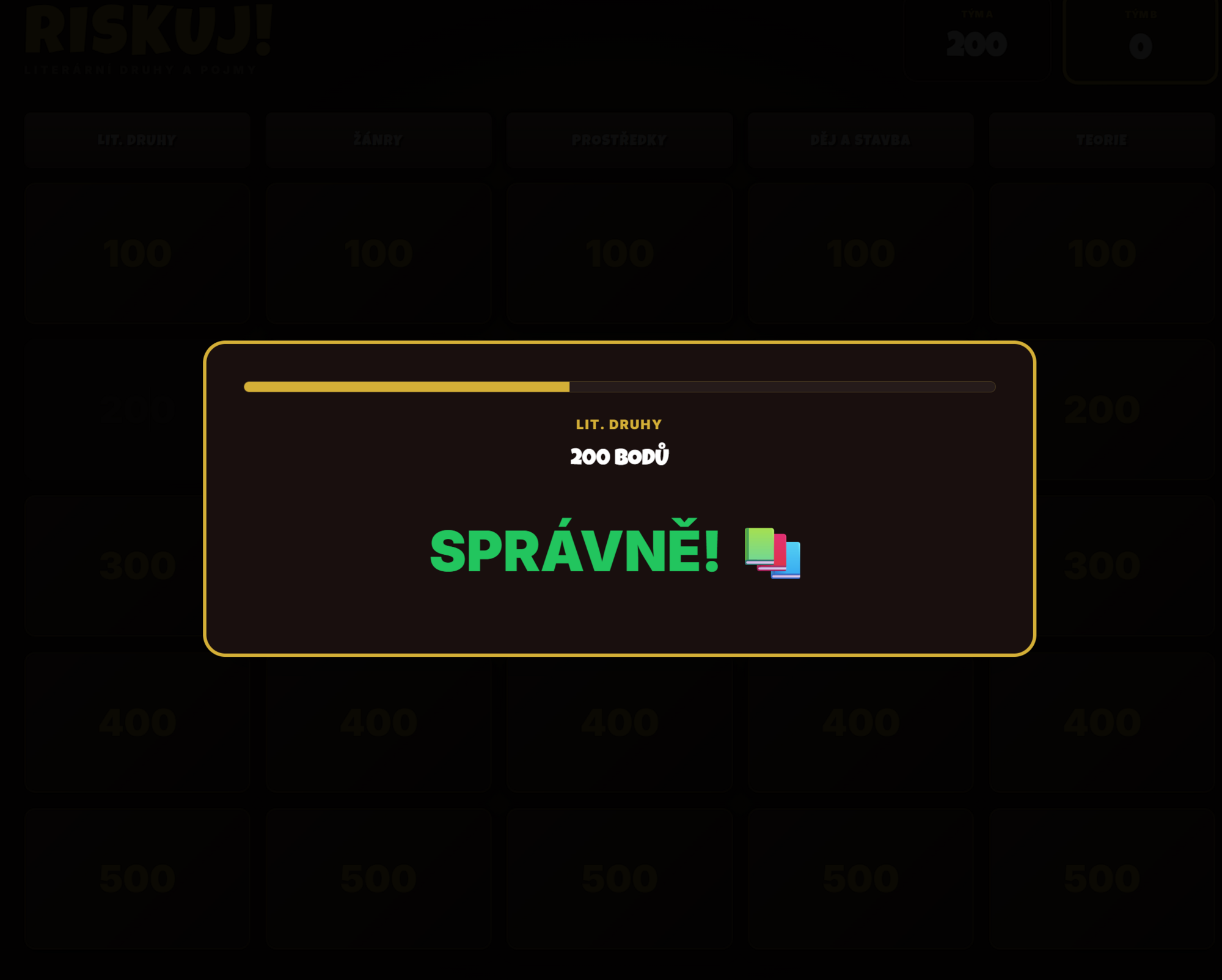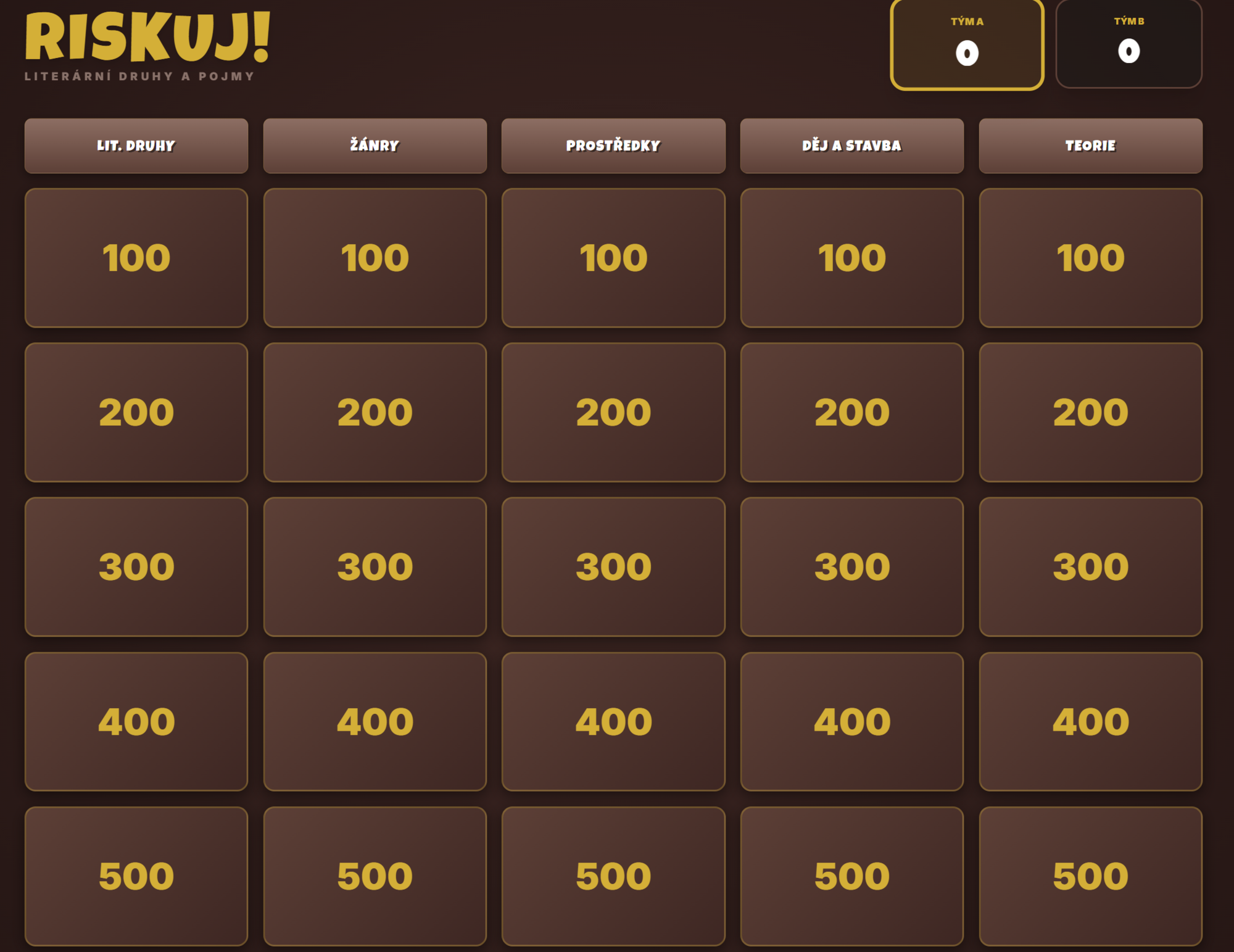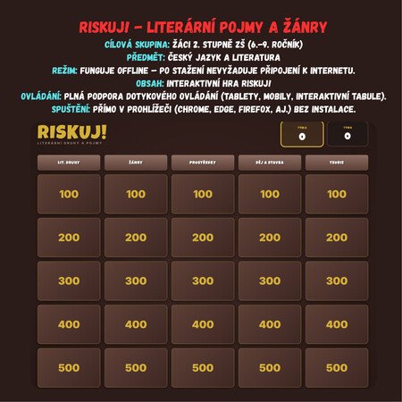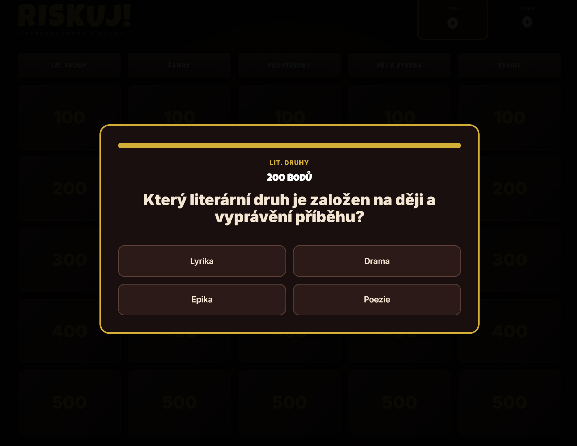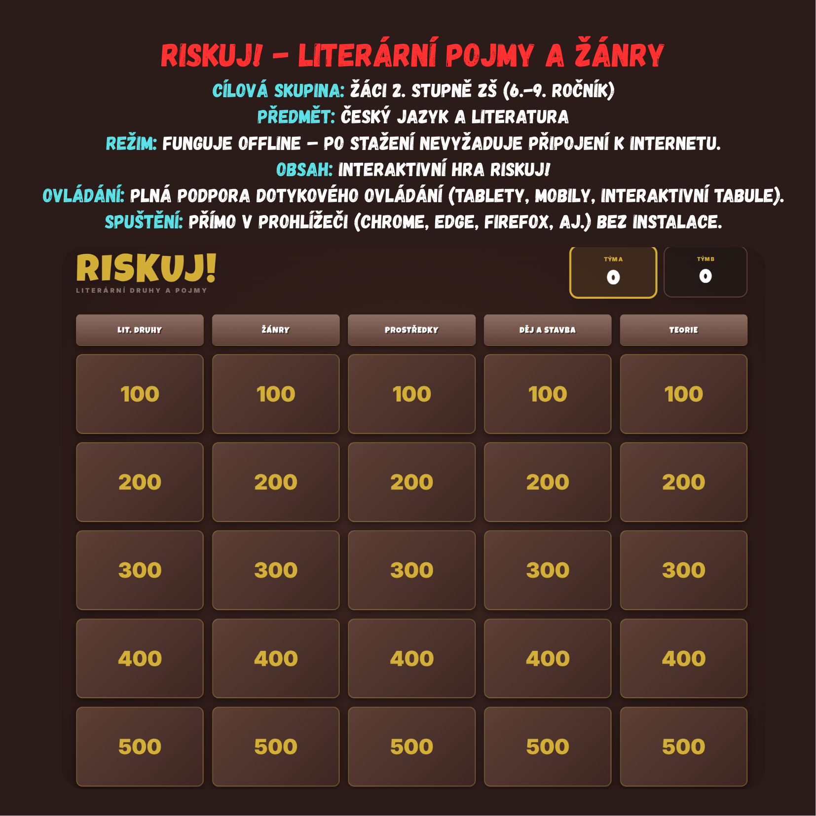 Tato aktivita je digitální vzdělávací hra typu soutěžního kvízu, která je vytvořena ve formátu HTML5. Je navržena pro žáky 2. stupně ZŠ jako hravý nástroj k procvičení a upevnění znalostí z oblasti literární teorie.