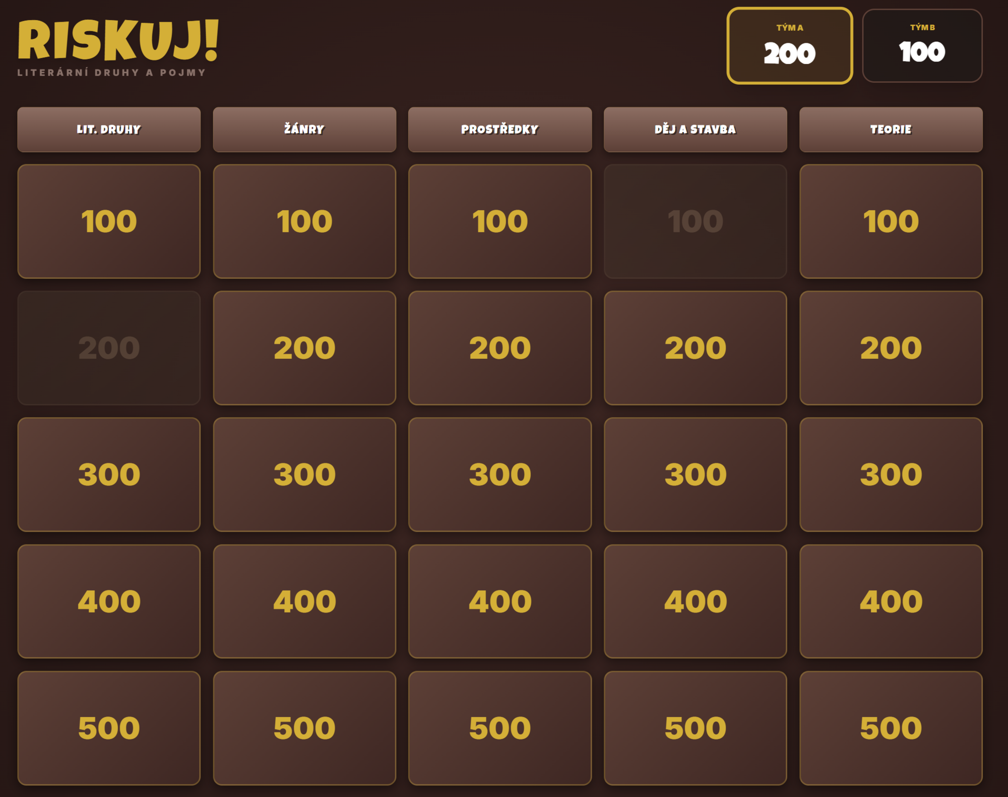 - Bodování a obtížnost: Otázky mají hodnotu od 100 do 500 bodů podle náročnosti. Za správnou odpověď tým body získává, za chybu nebo vypršení limitu se mu body odečítají.