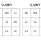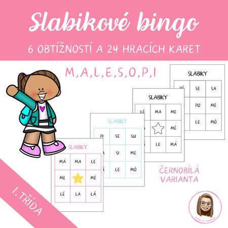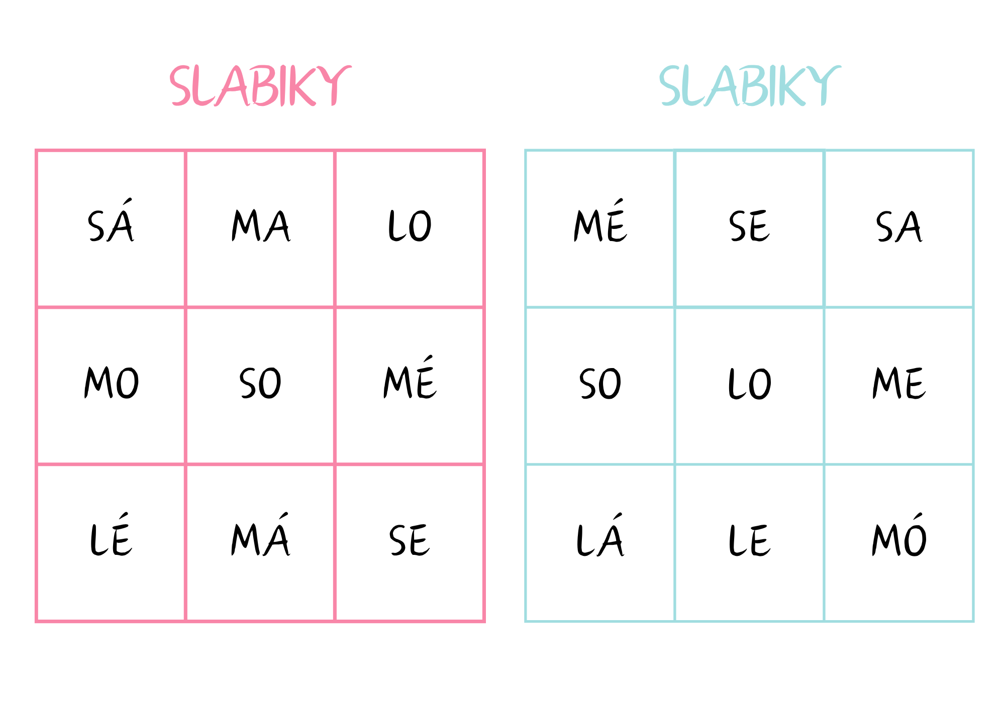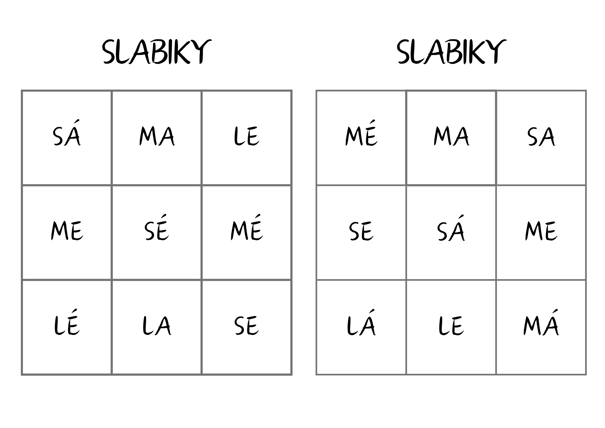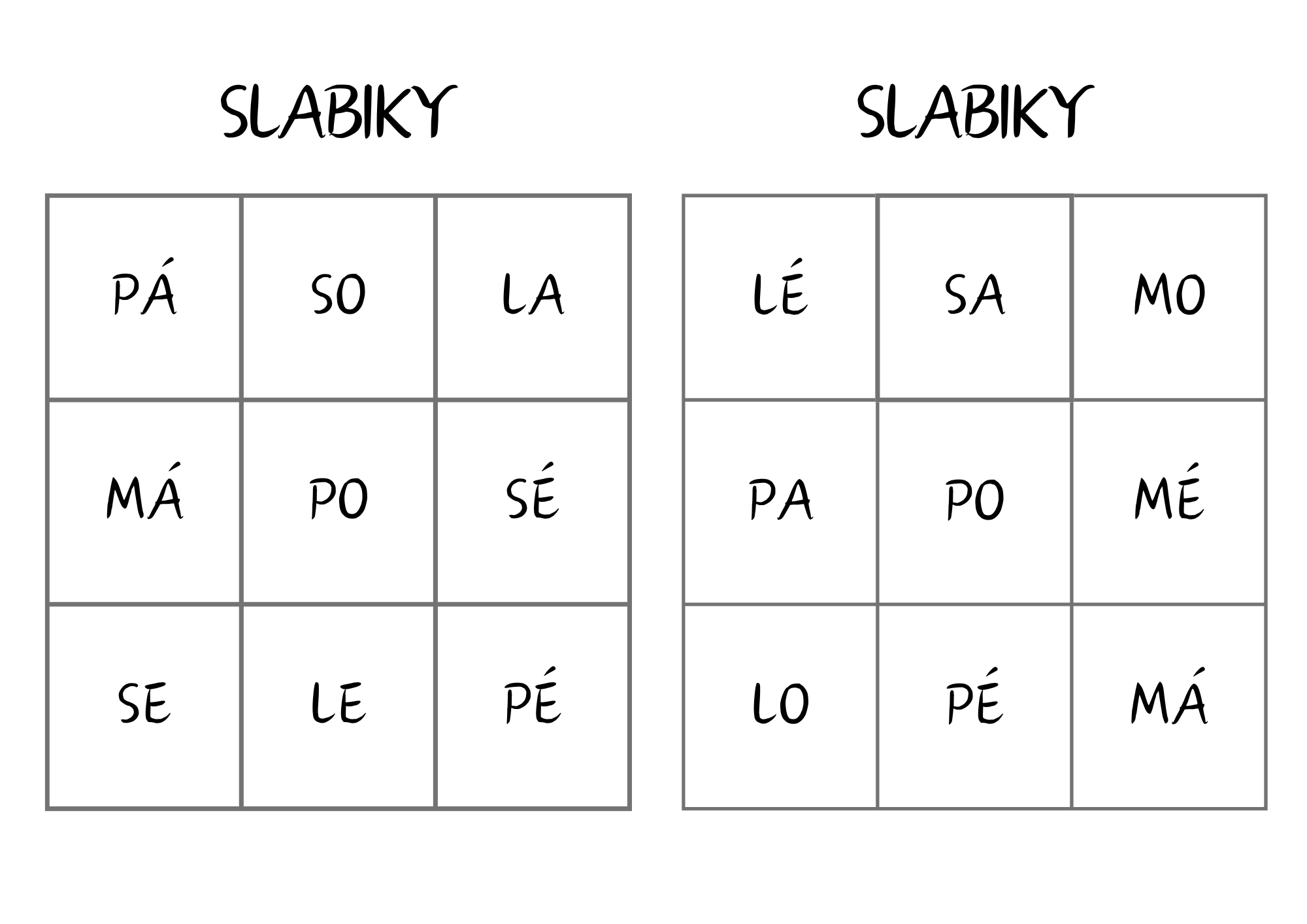 Jednoduchá hra Bingo na zopakování učiva - první slabiky. Nejprve si děti vyberou jednu ze 4 tabulek k zrovna procvičovaným slabikám.