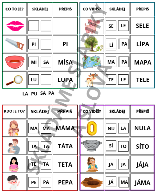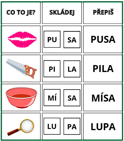 První zadání: Děti vystřihují slabiky, čtou je, přikládají na správná místa, slabikují výsledek. V případě správnosti přepíší slovo do třetího volného pole.