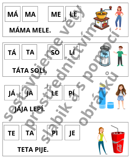 Třetí úloha: Sestavování celých vět dle slabik s podporou obrázků.