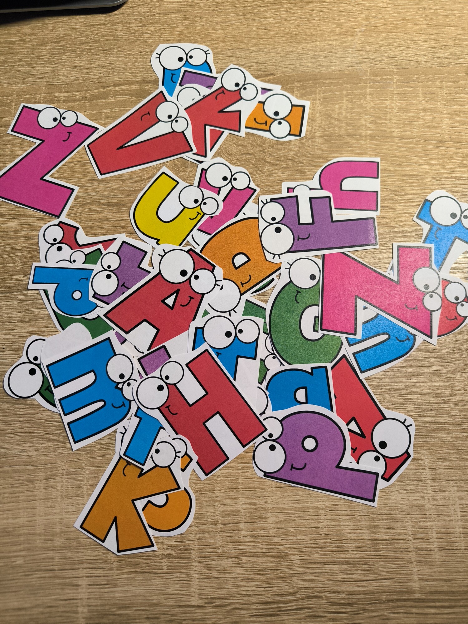 Cílem materiálu je rozvoj zrakového vnímání tvarů písmen, rozlišování barev a figur. Dalším cílem je upevnit si abecední řazení písmen a rozvoj slovní zásoby. Materiál lze využít v hodinách českého jazyka/čtení/psaní/ nebo v hodině pracovních činností a z písmen tvořit jméno, koláže apod.