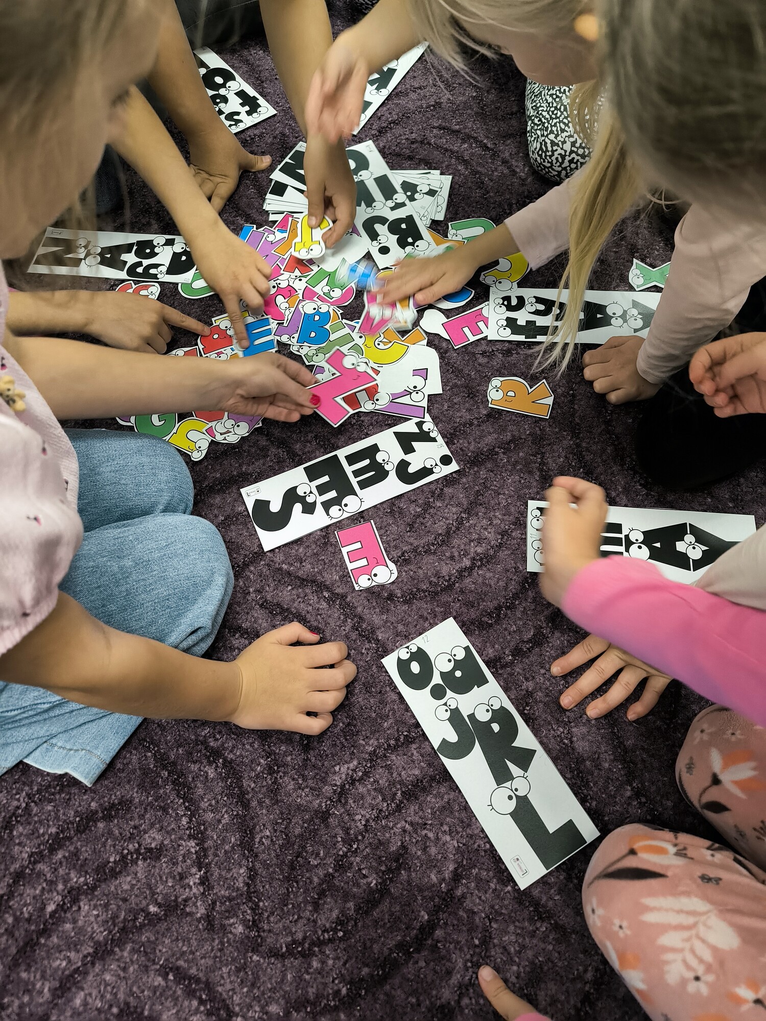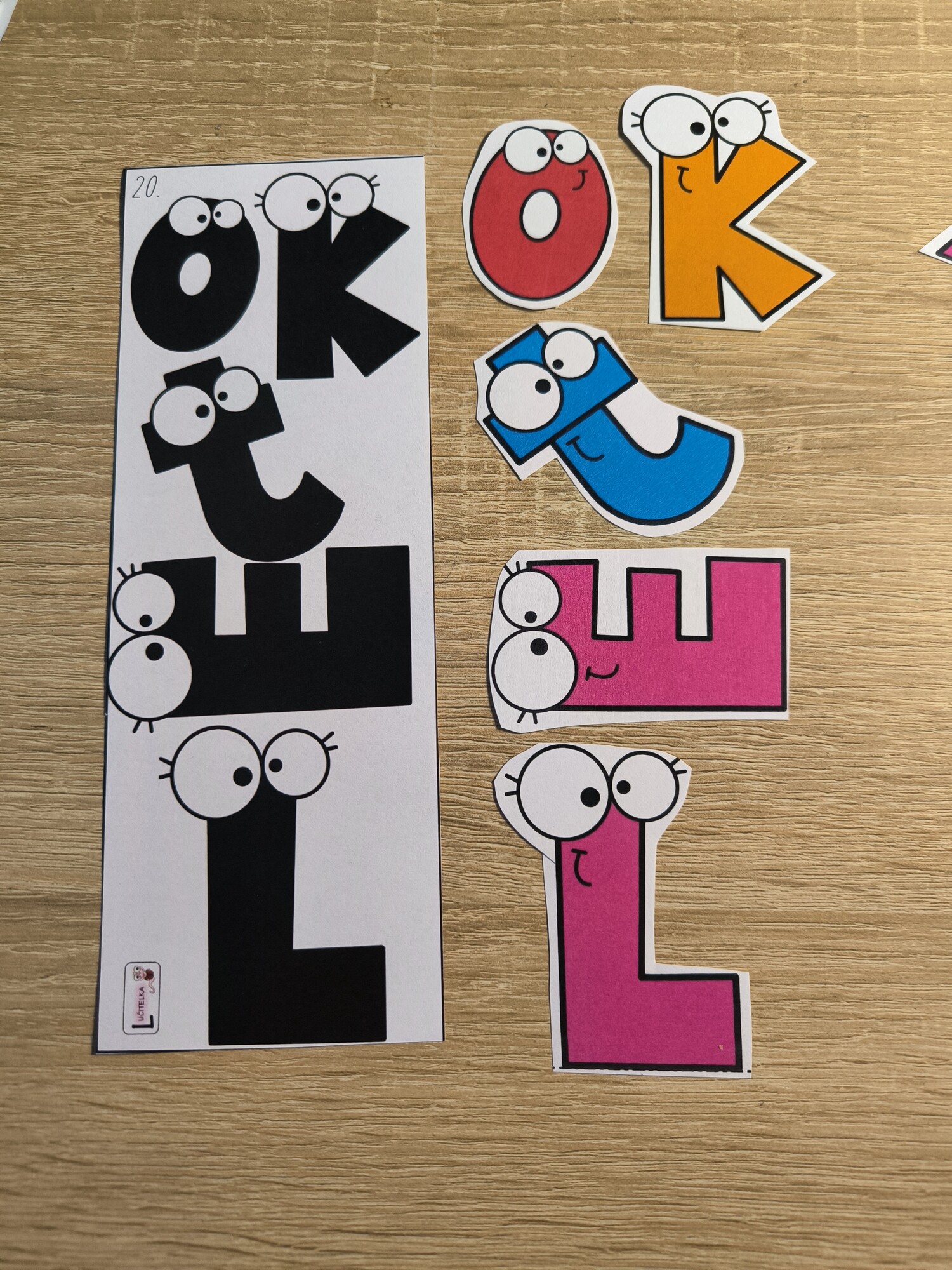 4. Slova – žáci z černobílých písmen si mohou vystříhat a nalepit jmenovky či skupinové koláže. Žáci se touto aktivitou mohou spolupodílet na výzdobě třídy.