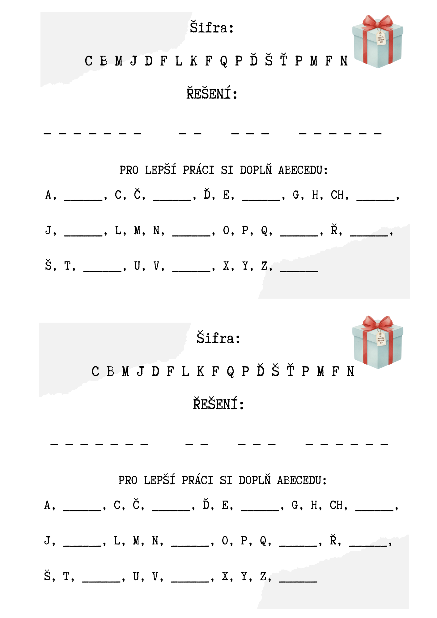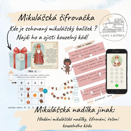 Mikulášská nadílka jinak - děti pomocí šifry hledají mikulášský balíček a mají úkol odhalit tajný kód k jeho otevření. Materiál je vhodný pro děti od 2. - 4. třídy.