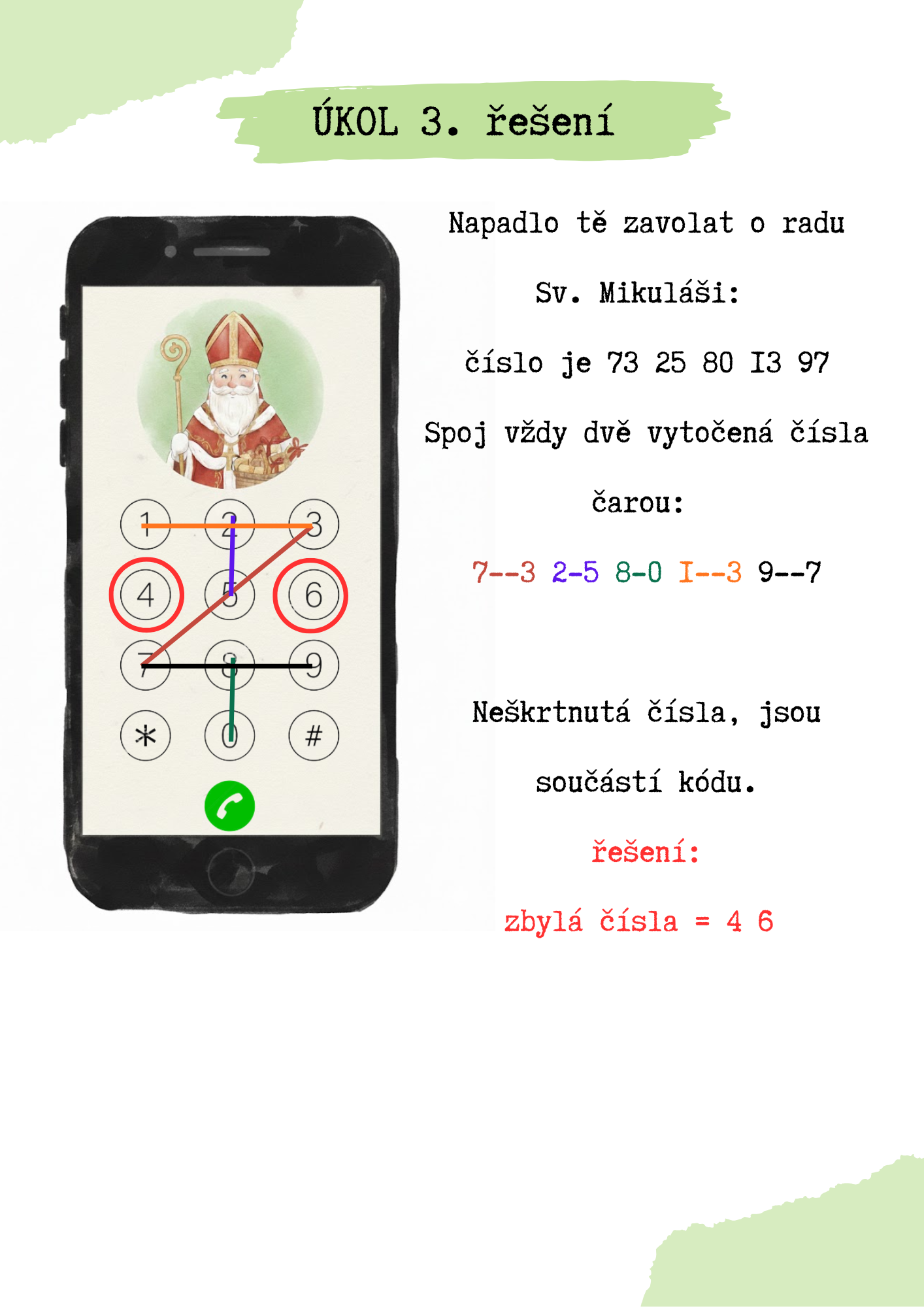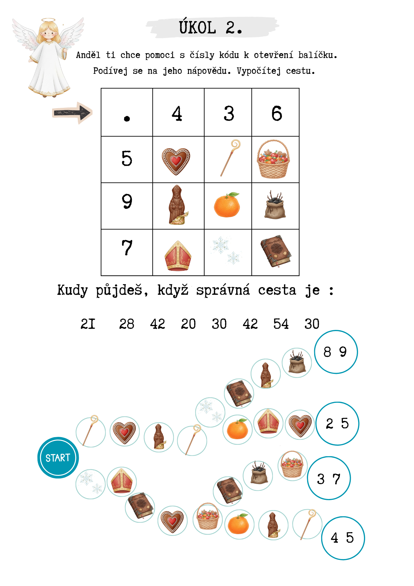 - 3 úkoly - s andělem, čertem a Mikulášem, pomoci kterých získají děti kouzelný kód k otevření balíčku + řešení