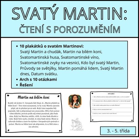 Tento soubor slouží k procvičení čtení s porozuměním a seznámení s českou tradicí a historií o životě a skutcích svatého Martina, gastronomii a lidových pranostikách.