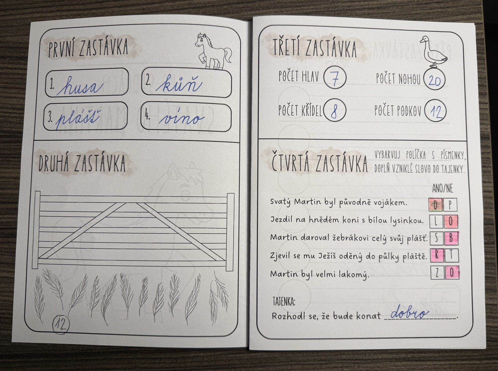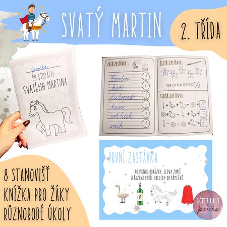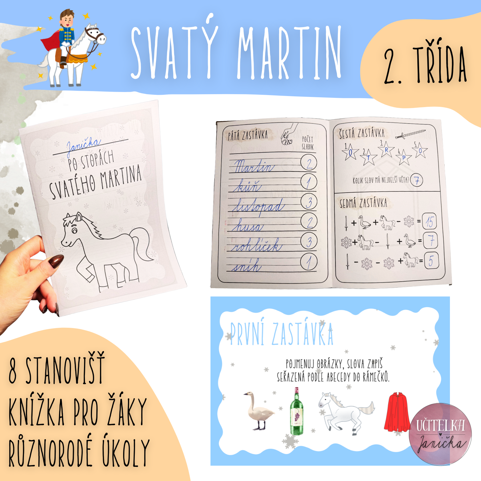 Materiál je tematicky laděn k 11. listopadu a propojuje čtení, psaní, počítání a logické úkoly s tradicí sv. Martina. Žáci postupují po 8 stanovištích, čtou zadání a plní úkoly do své knížečky. Na závěr probíhá sebehodnocení.