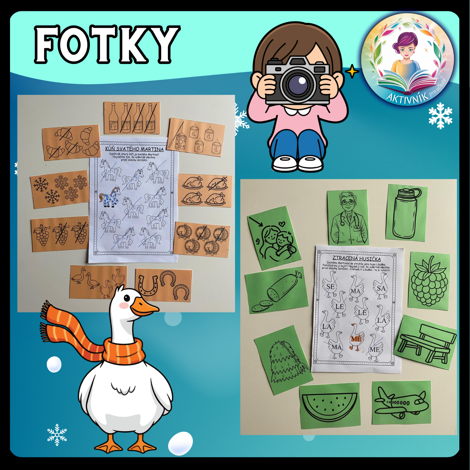 Na chodbě jsou rozmístěné obrázky. Dítě si obrázek zapamatuje a na pracovním listě škrtne husičku, která nese 1. slabiku obrázku (malina = MA). Když správně vyškrtají všechny slabiky, najdou ztracenou husičku.