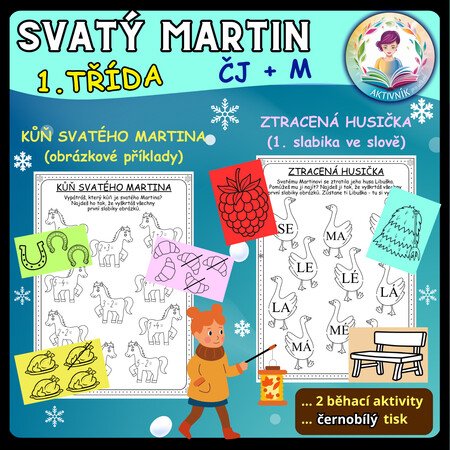 Vypátrají žáci koně sv. Martina? Pomohou najít Martinovi ztracenou husičku? Zábavné procvičení počítání do 5 a první slabiky ve slově. V materiálů najdete 2 různé hry (ČJ+M).