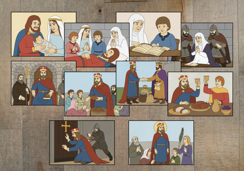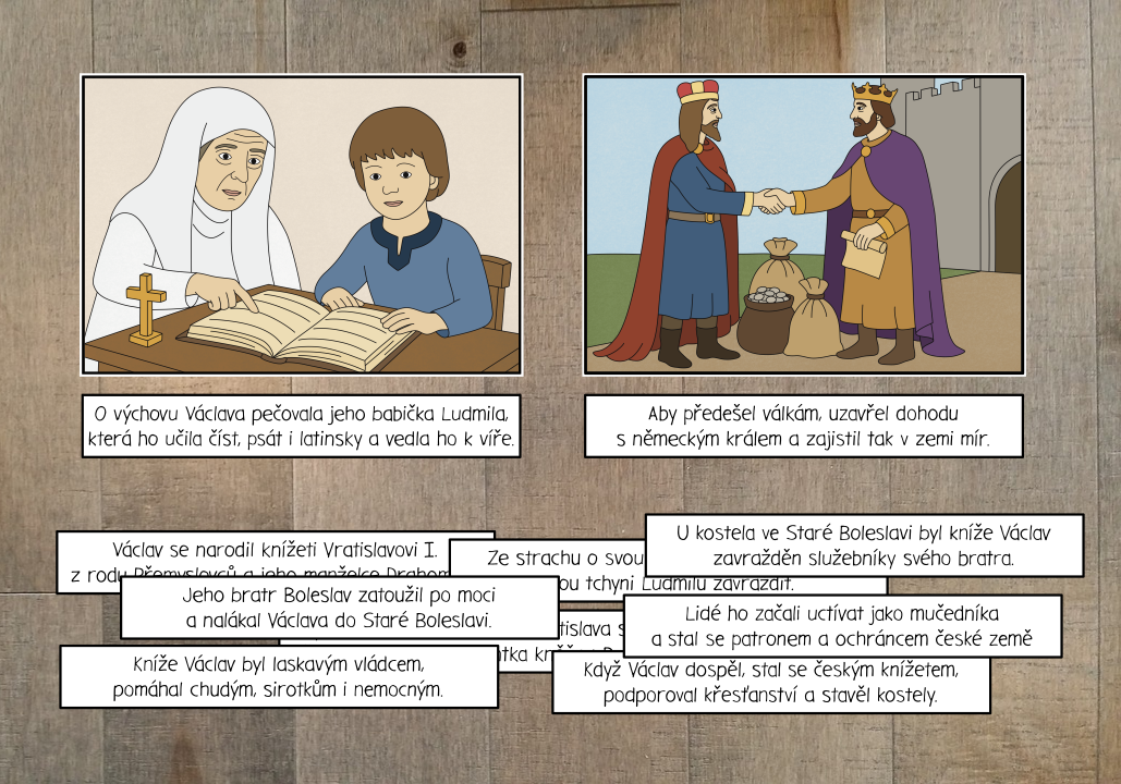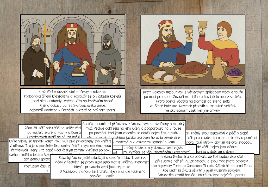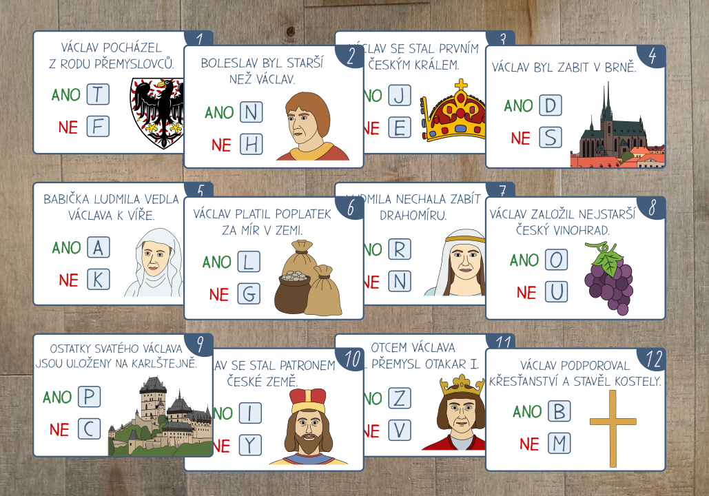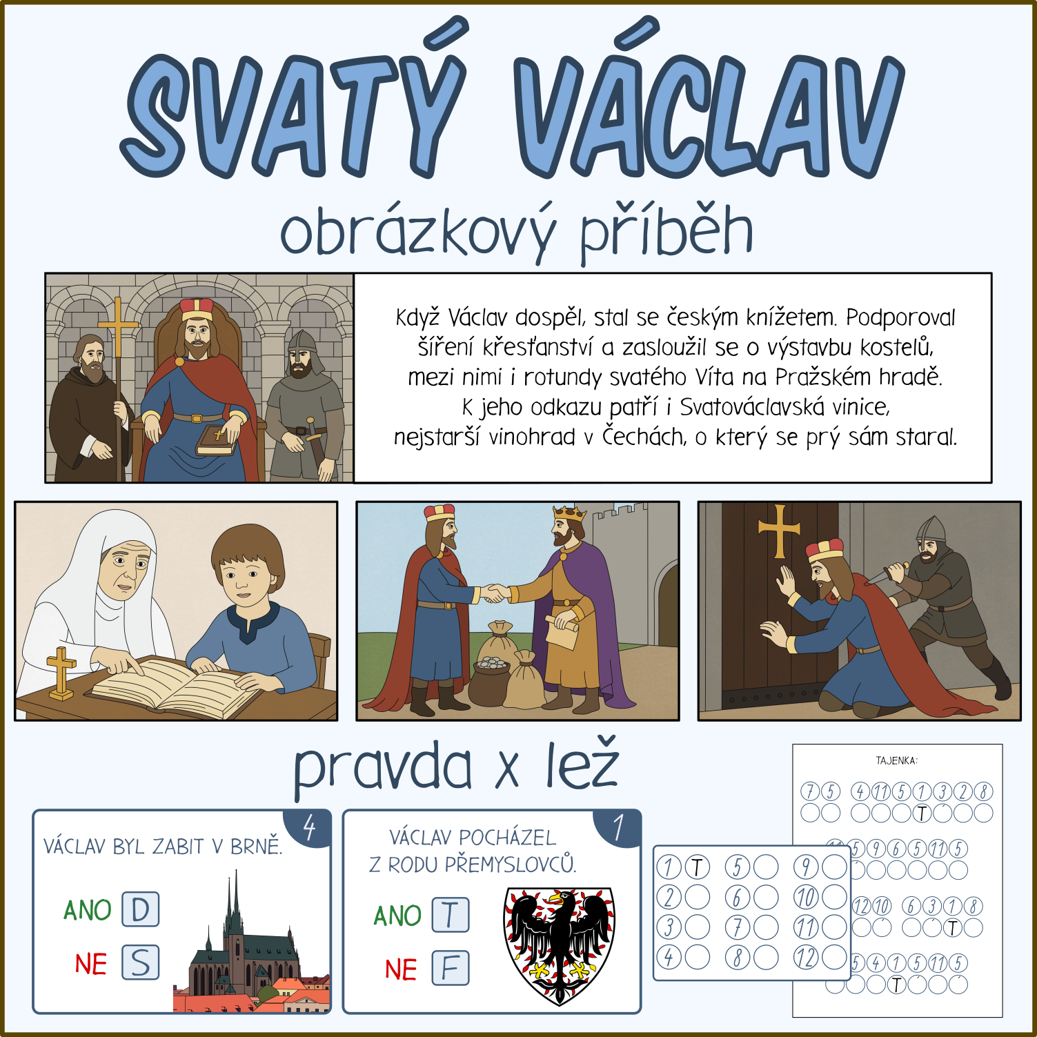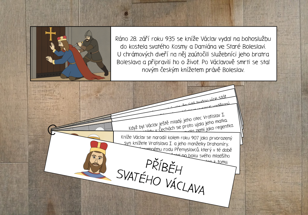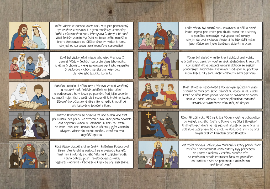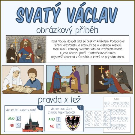 Sada příběhových karet o svatém Václavovi. Celkem 10 ilustrovaných karet zachycujících nejdůležitější okamžiky. Dále šifrovačka, díky které si děti upevní získané znalosti.