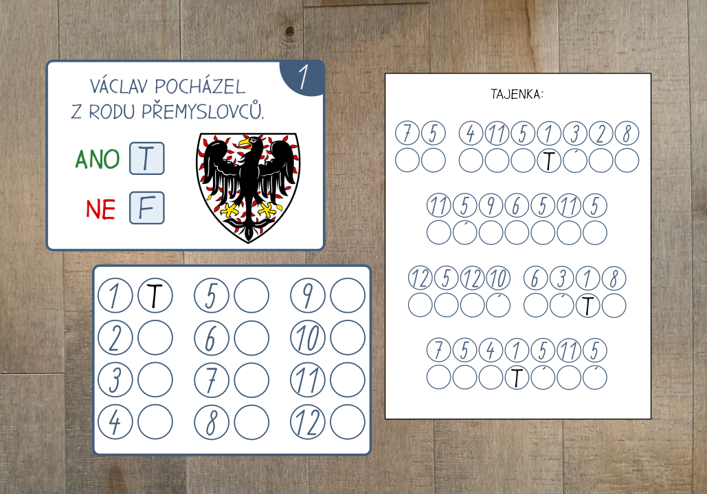 - 12 karet s tvrzeními, šifrovací kartička a tajenka