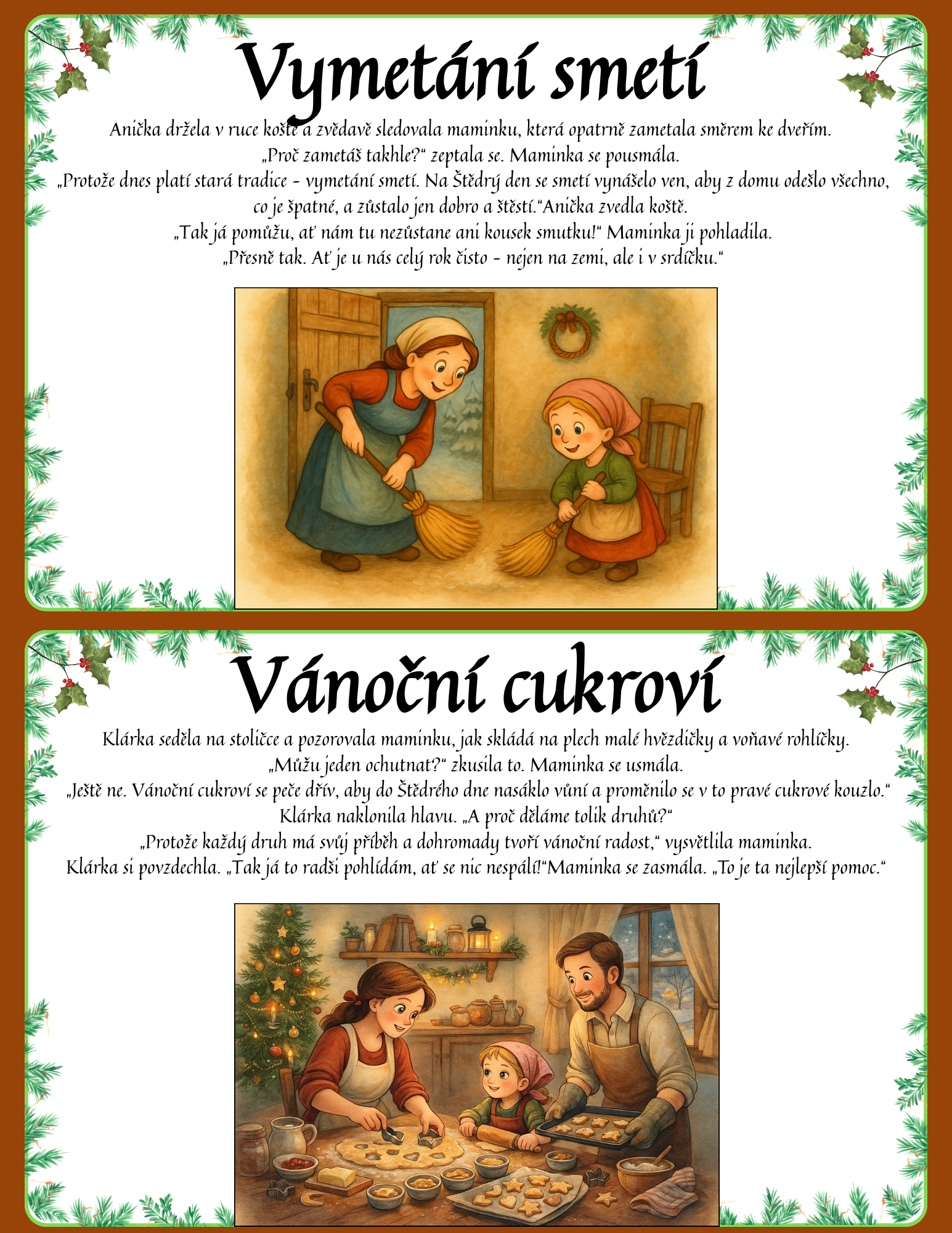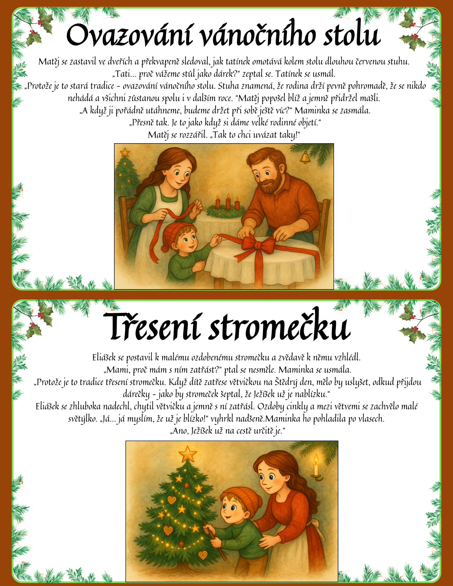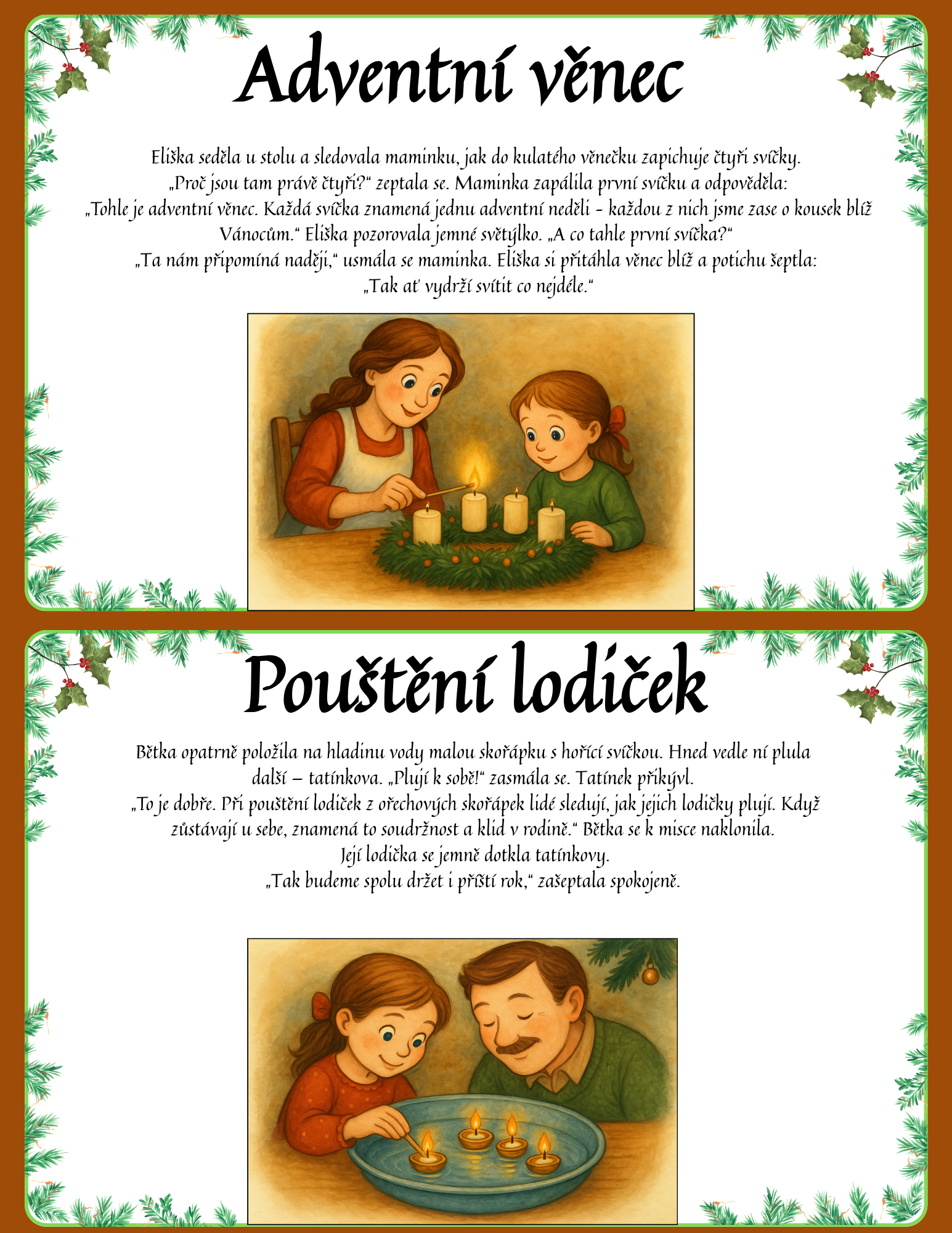 Najdete v ní 34 ilustrovaných karet velikosti A5, které jsou ideální k zalaminování a každoročnímu využití ve třídě i doma. Každá karta obsahuje krátký mikro-příběh, který dětem jednoduše a poutavě vysvětlí význam dané tradice. Součástí každé karty je také originální jemná ilustrace ve stylu akvarelu, ladící s vánoční atmosférou.