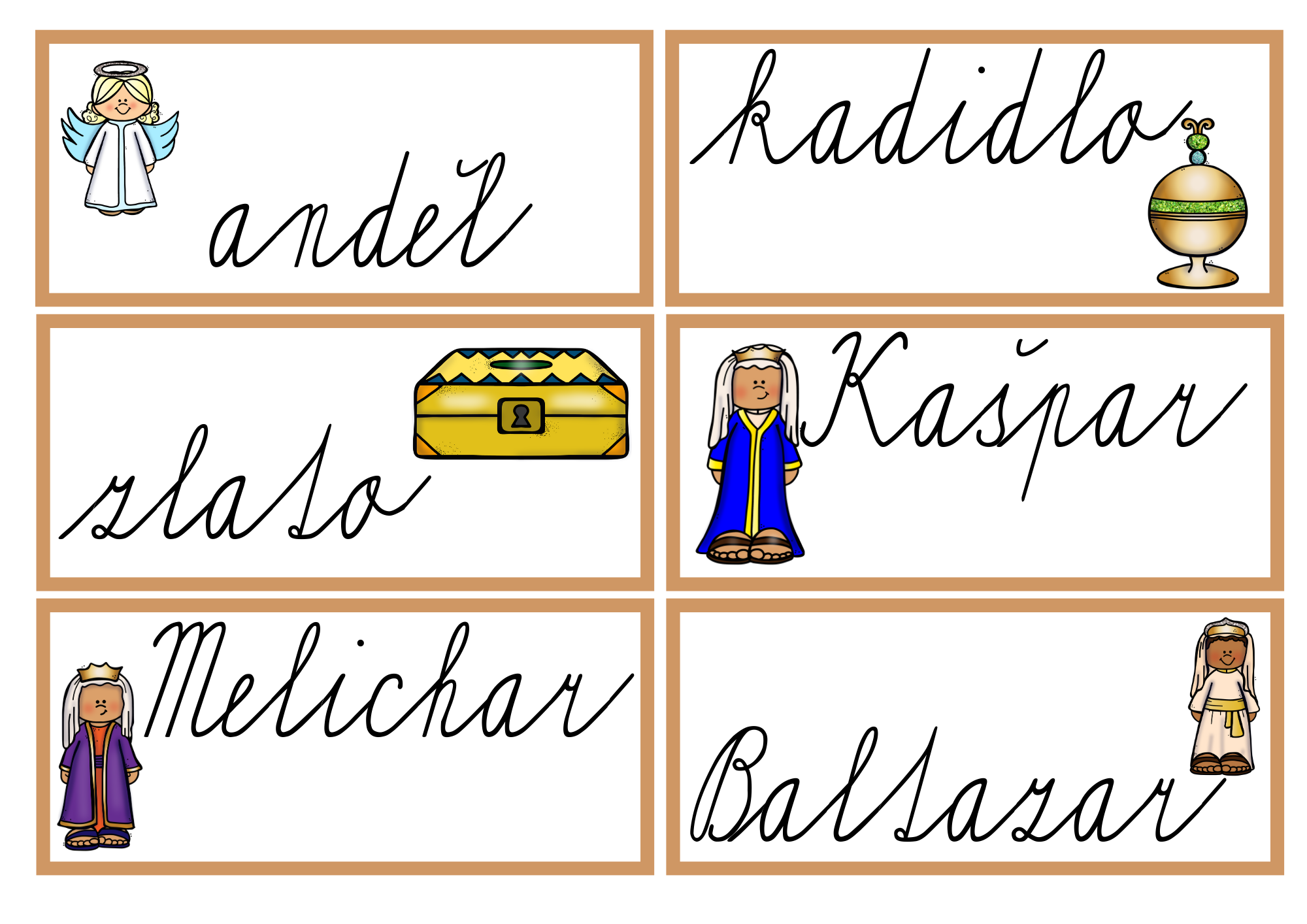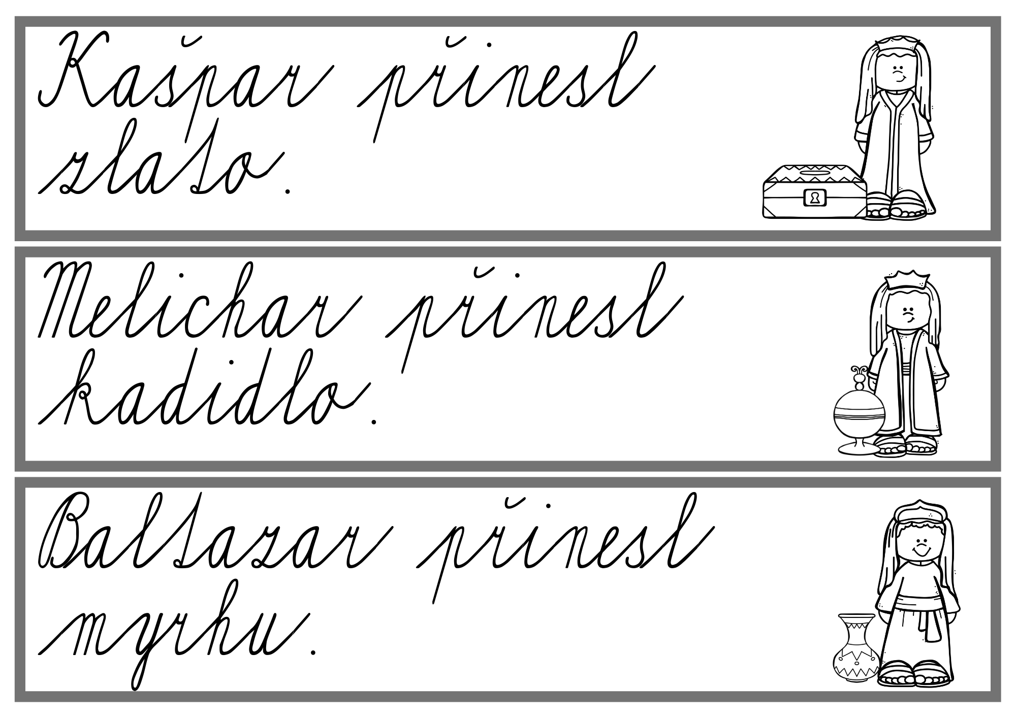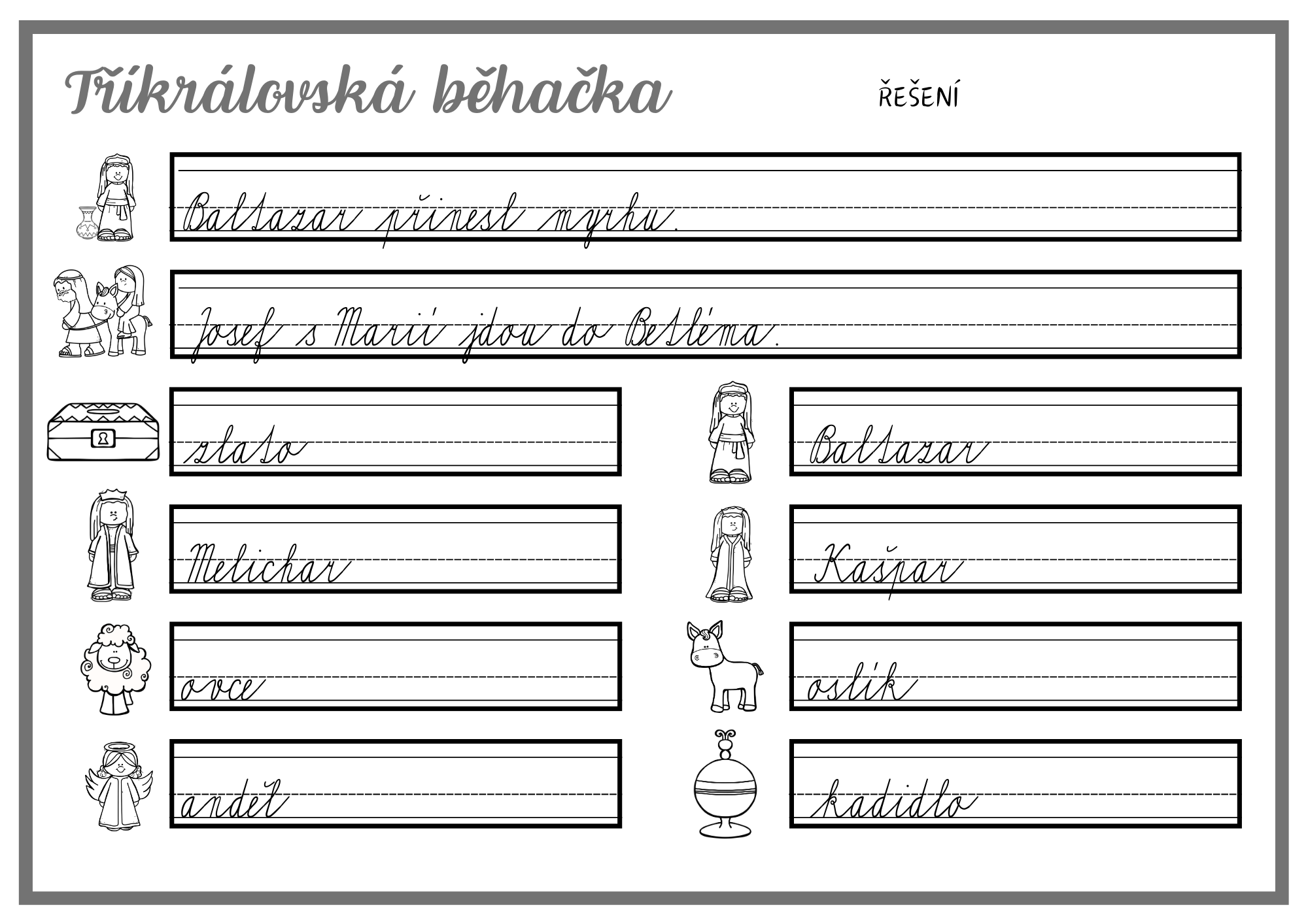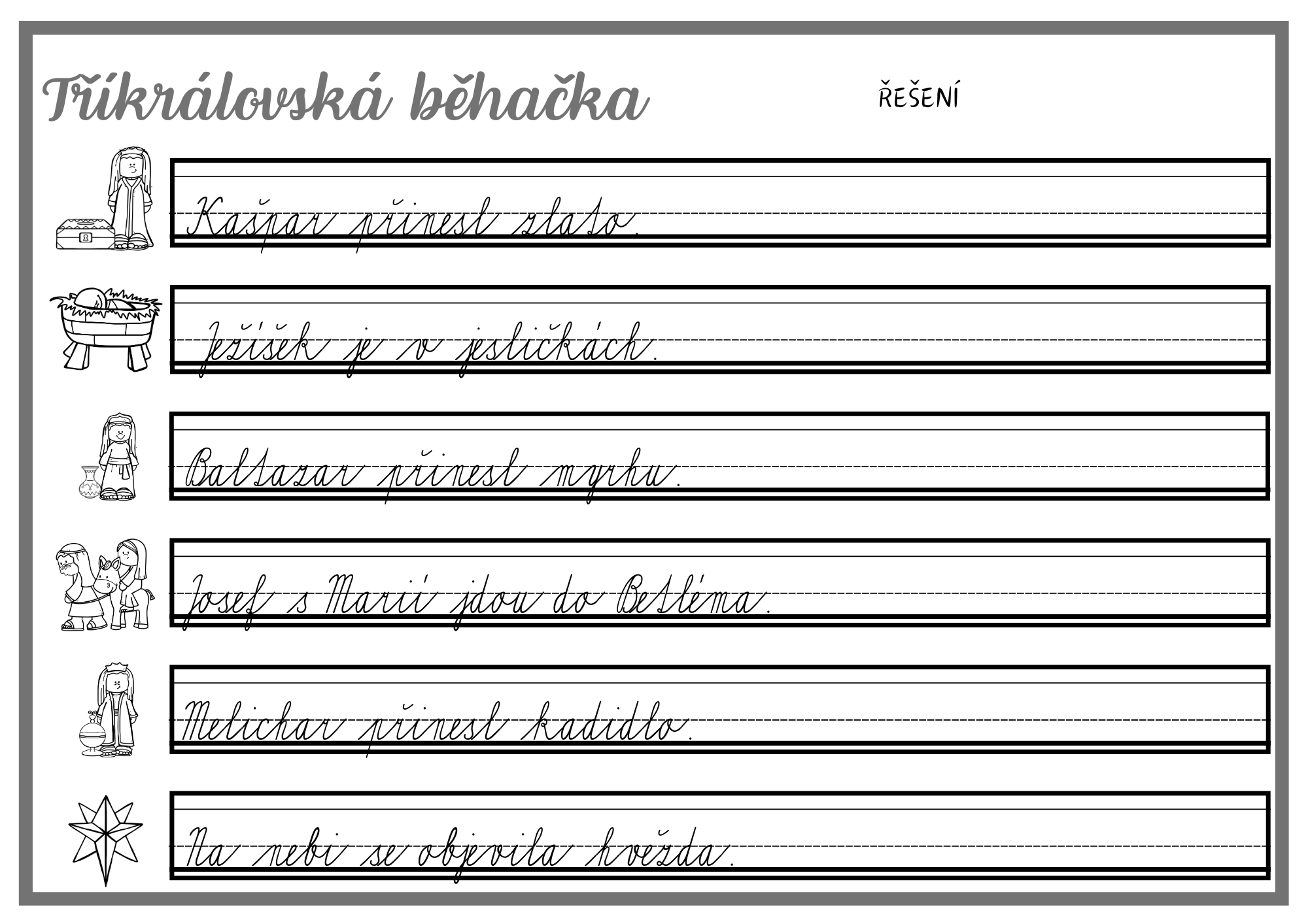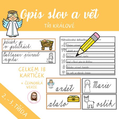 Děti pracují s větami a slovy s tematikou Tří králů, vyhledávají kartičky rozmístěné po třídě a zapisují je do záznamového archu.