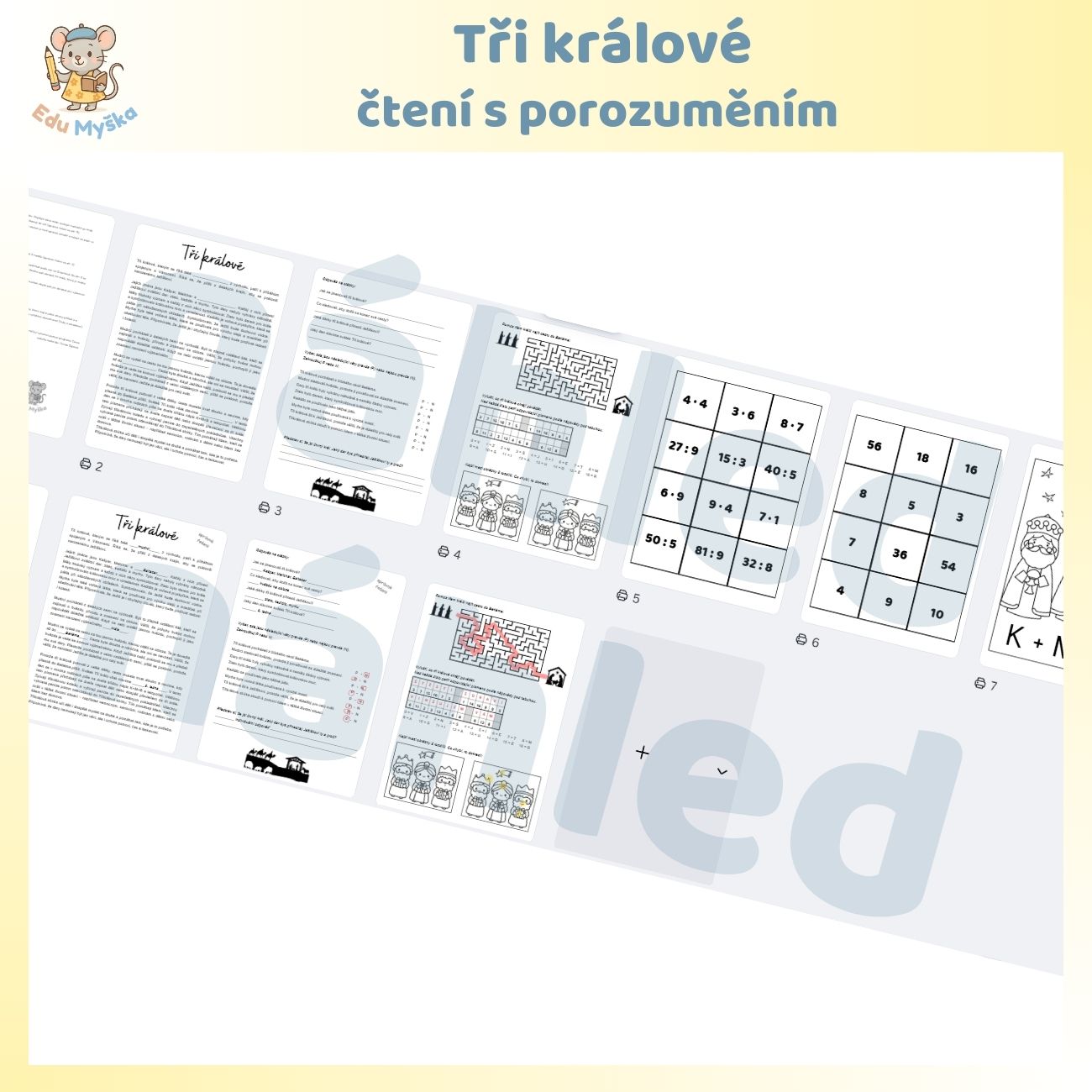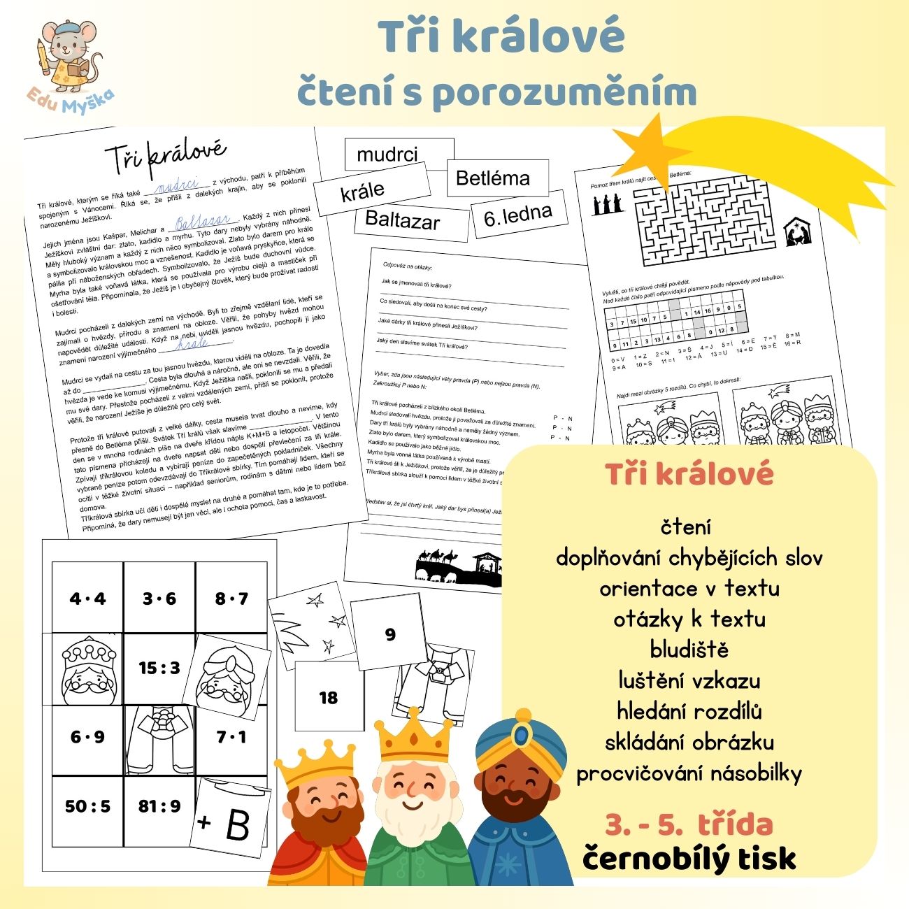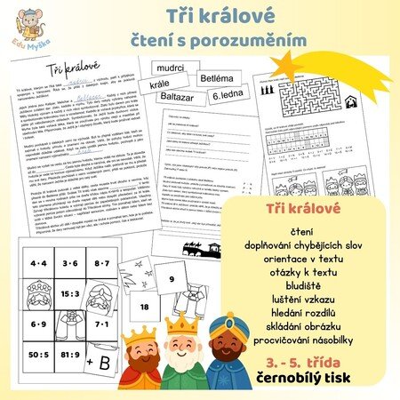 * text o třech králích, kde chybí 5 slov. Chybějící slova může vyučující rozmístit po třídě. Žáci je hledají a pak podle smyslu dopisují do vět. Žáci mohou text dostat rozstříhaný po odstavcích a jejich úkolem je text správně seřadit a nalepit na papír ve správném pořadí.