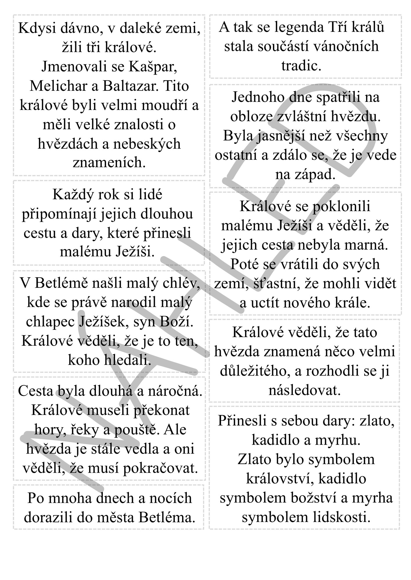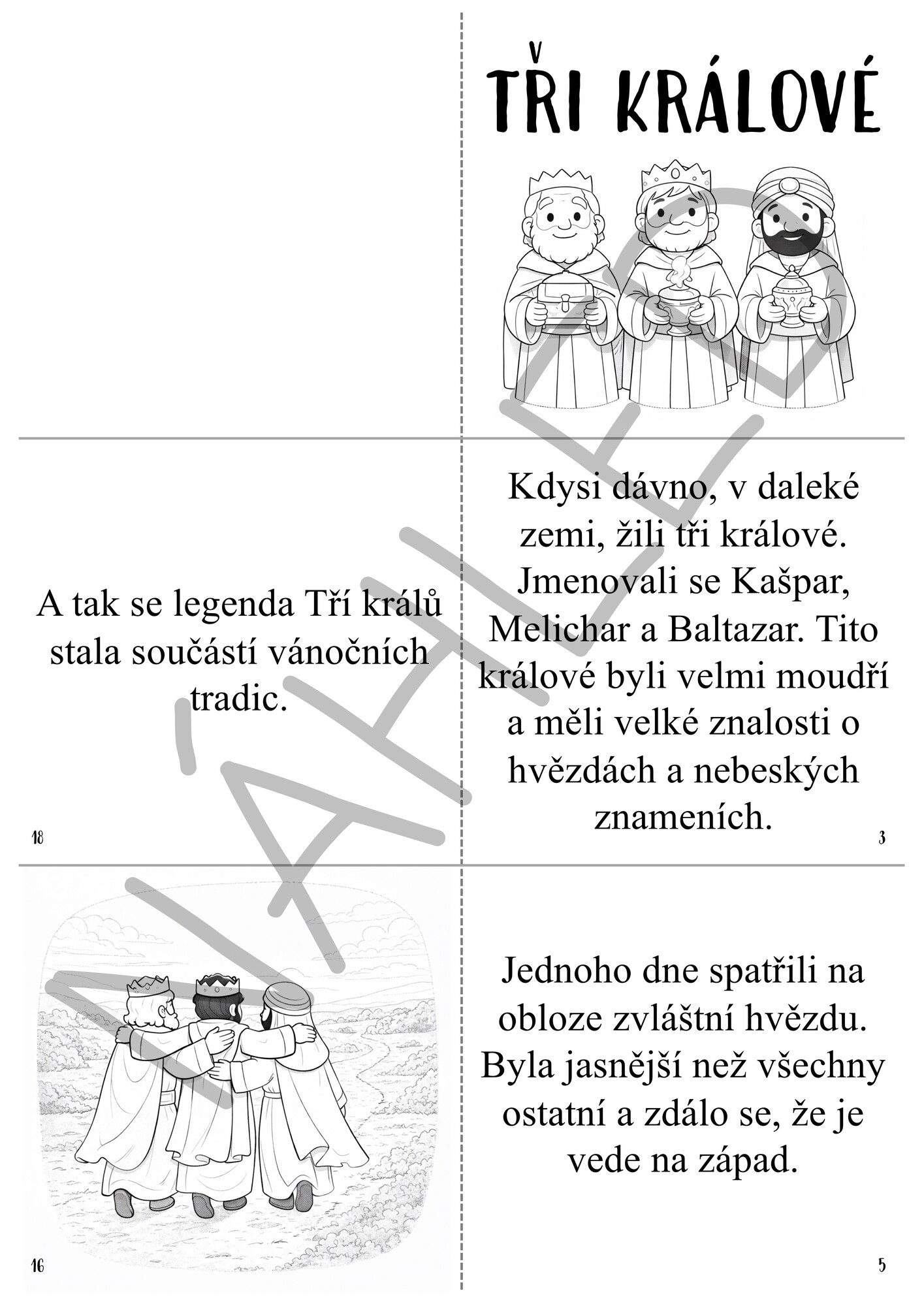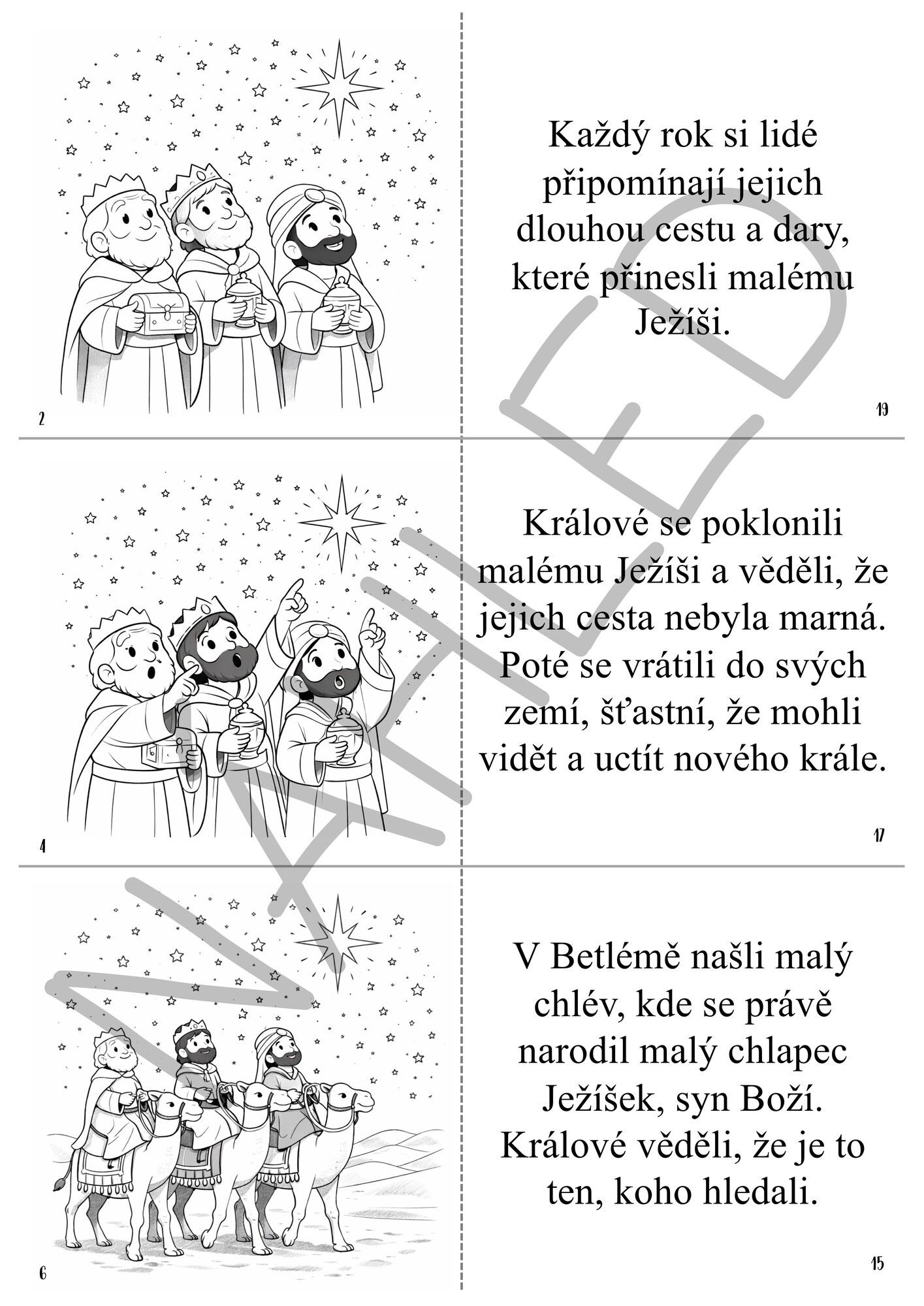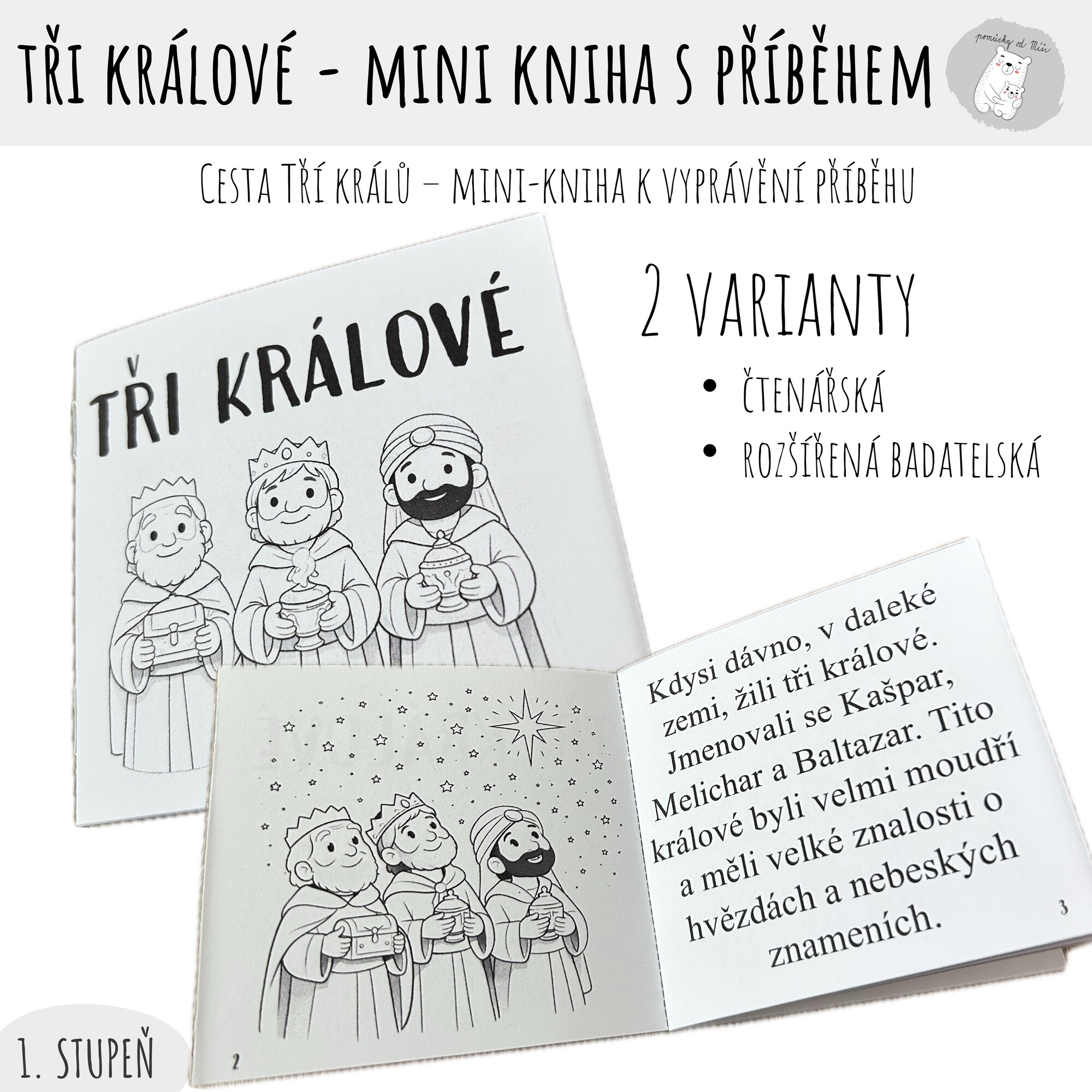 Materiál pracuje s příběhem tří králů formou mini knihy a nabízí dvě varianty práce s textem. Čtenářskou verzi s hotovým textem a badatelskou knihu bez textu, kde žáci text nejprve chronologicky seřadí a následně jej vlepují do knížky.