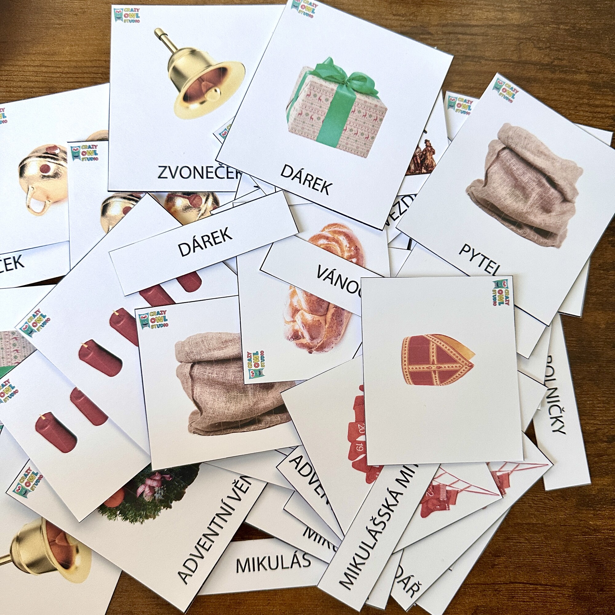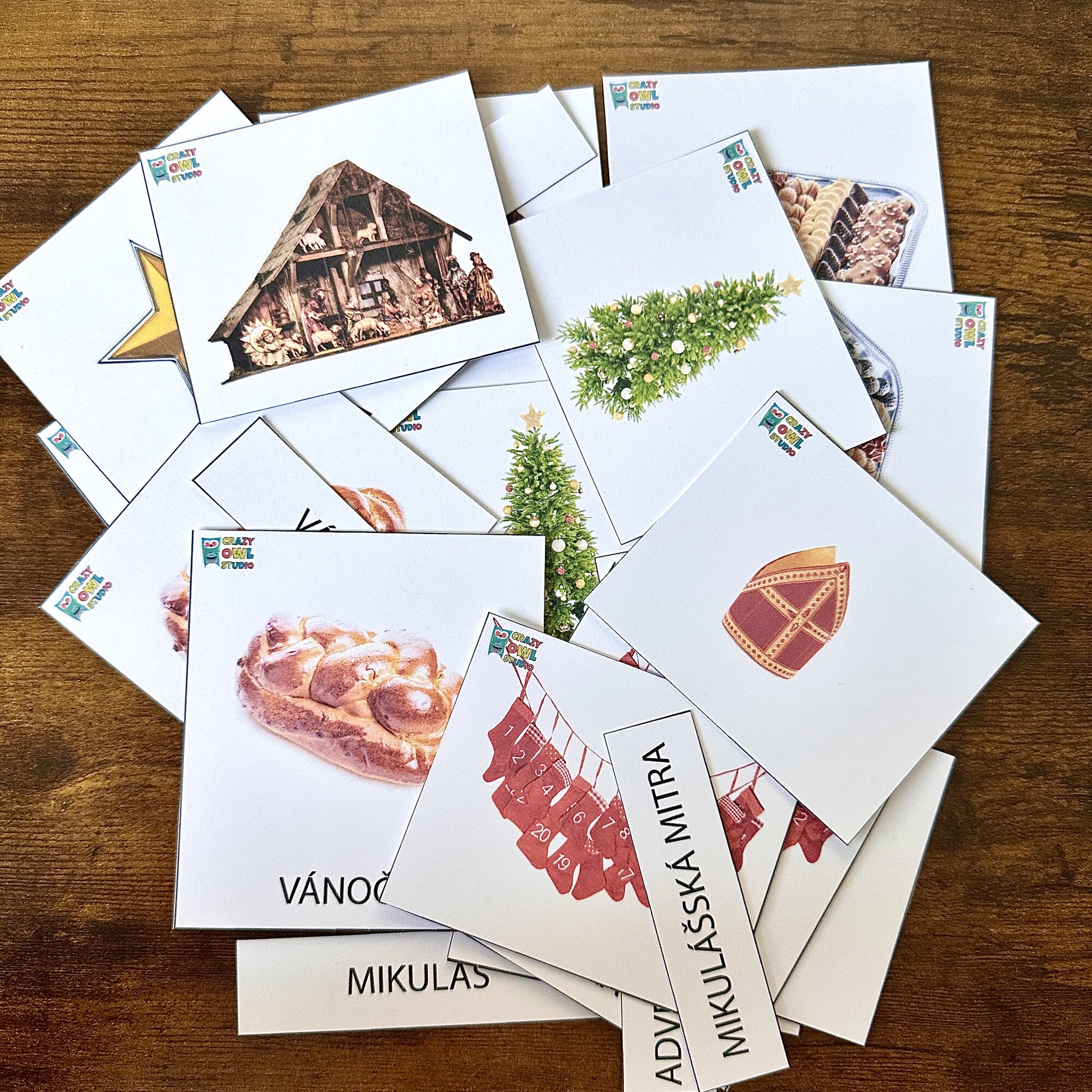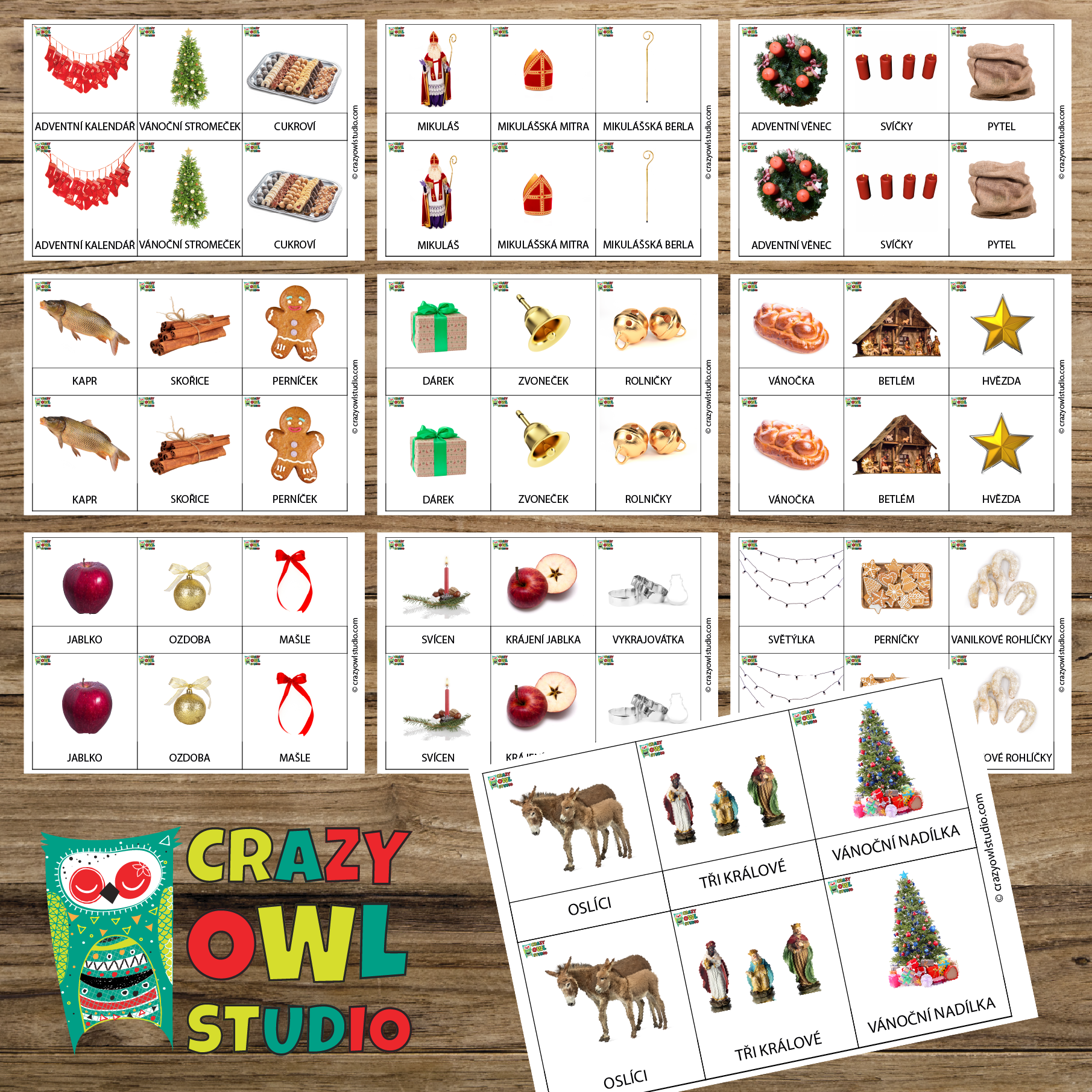 cukroví, vánočka, betlém, hvězda, Mikuláš, mikulášská mitra, mikulášská berla, jablko, ozdoba, mašle, adventní kalendář, vánoční stromeček,adventní věnec, svíčky, pytel, kapr, skořice, perníček, dárek, zvoneček, rolničky, podkova, bramborový salát, zlaté prasátko, jmelí, Barborky, vánoční hvězda, oslíci, Tři králové, vánoční nadílka, svícen, krájení jablka, vykrajovátka, světýlka, perníčky, vanilkové rohlíčky.
