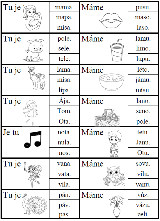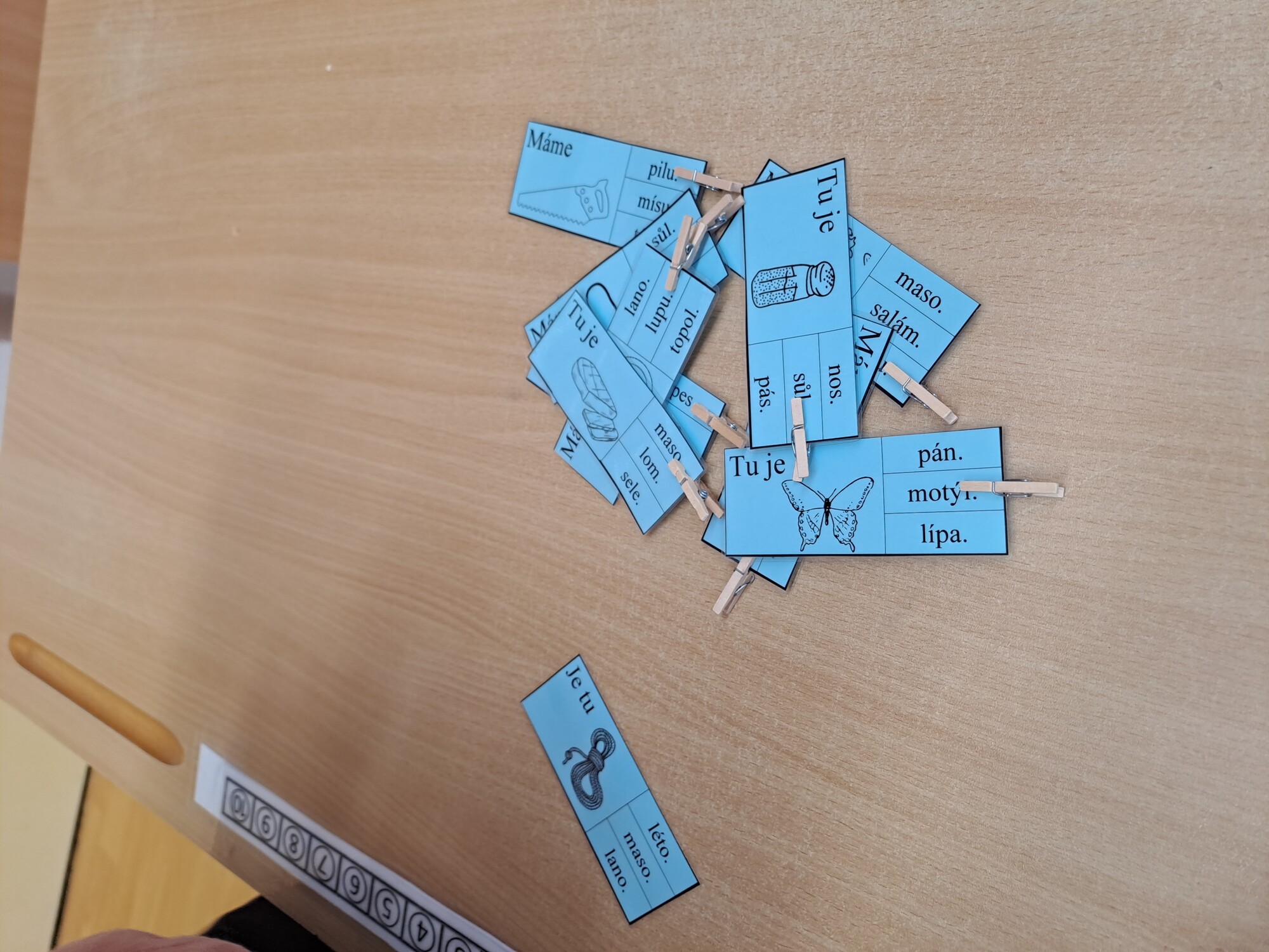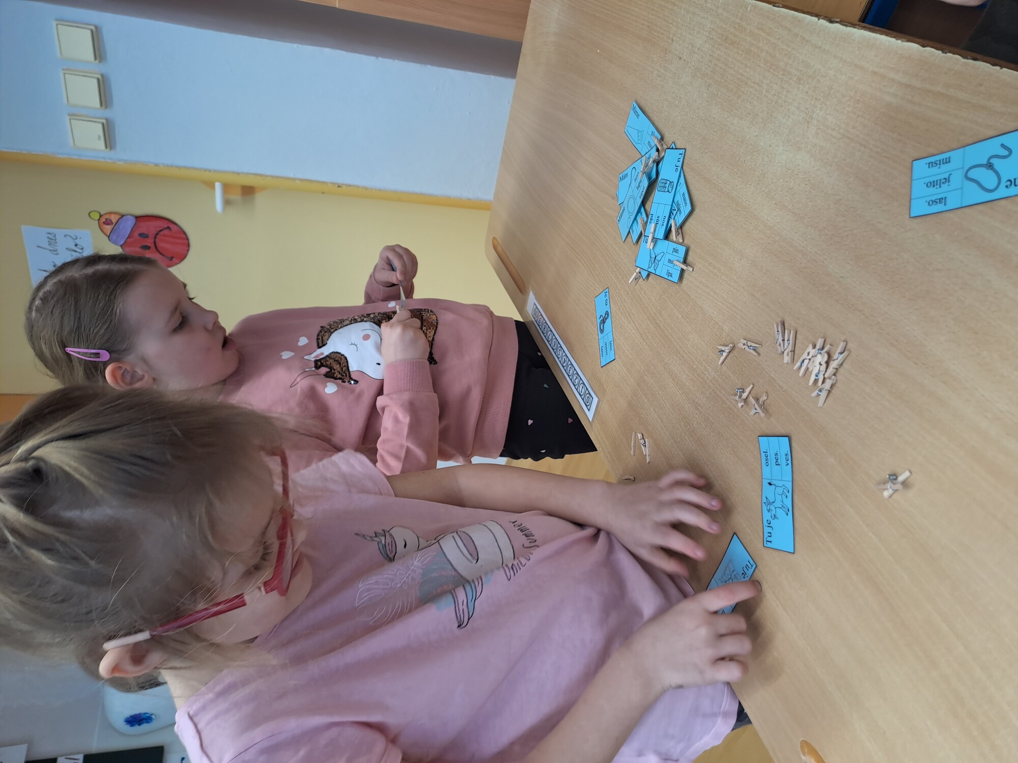Úkolem dětí je najít správné slovo podle obrázku na kartičce – kroužkování mazatelným fixem nebo připnutí kolíčku na správné políčko.