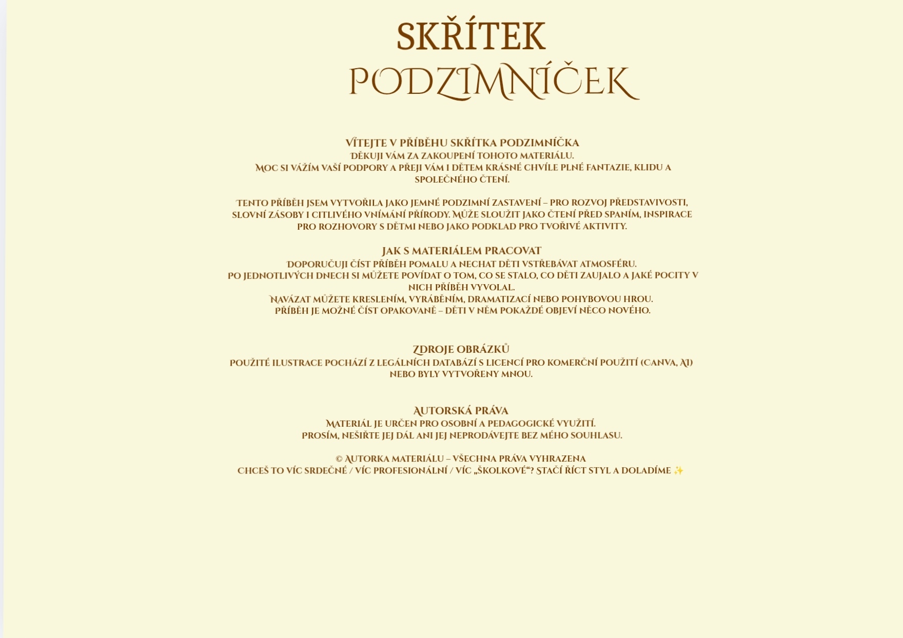 Knížečka je rozdělena do 5ti dní, kdy každý den obsahuje několik krátkých příběhů o dobrodružství malého skřítka Podzimníčka.