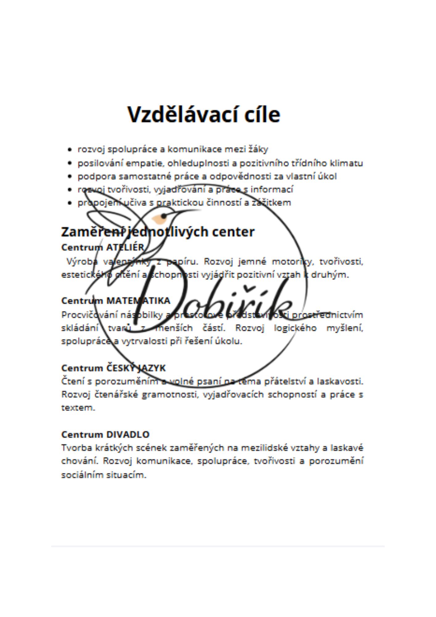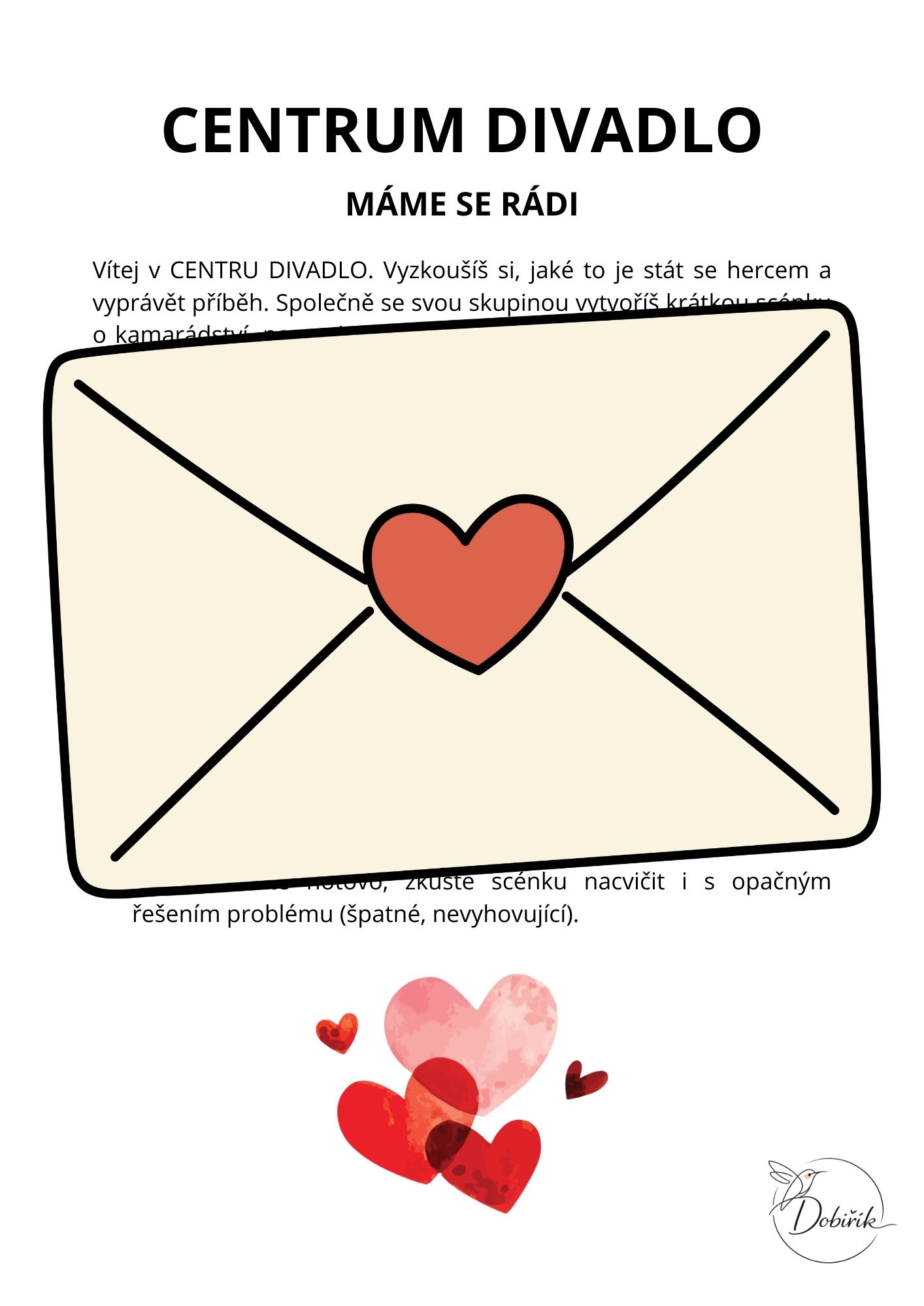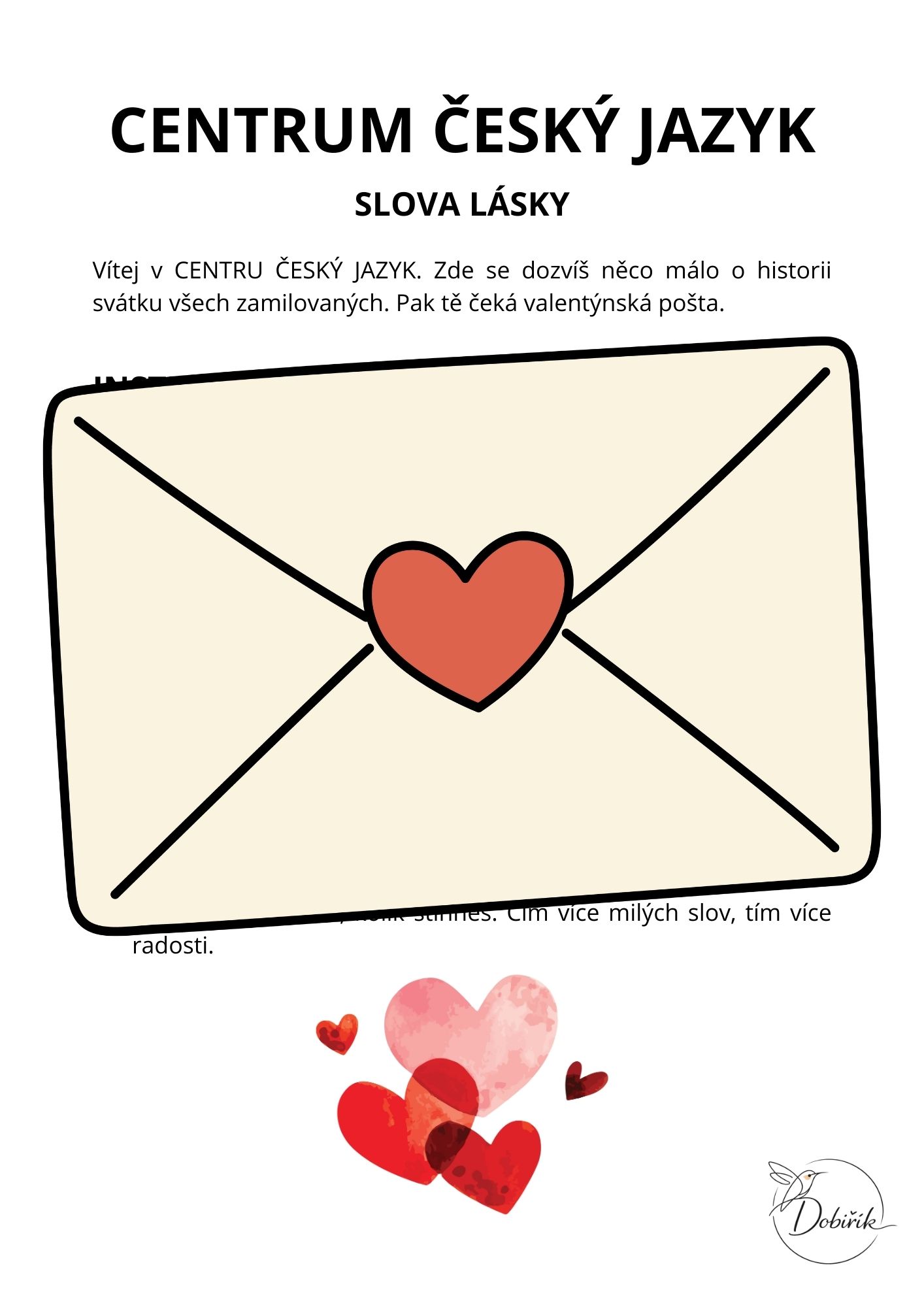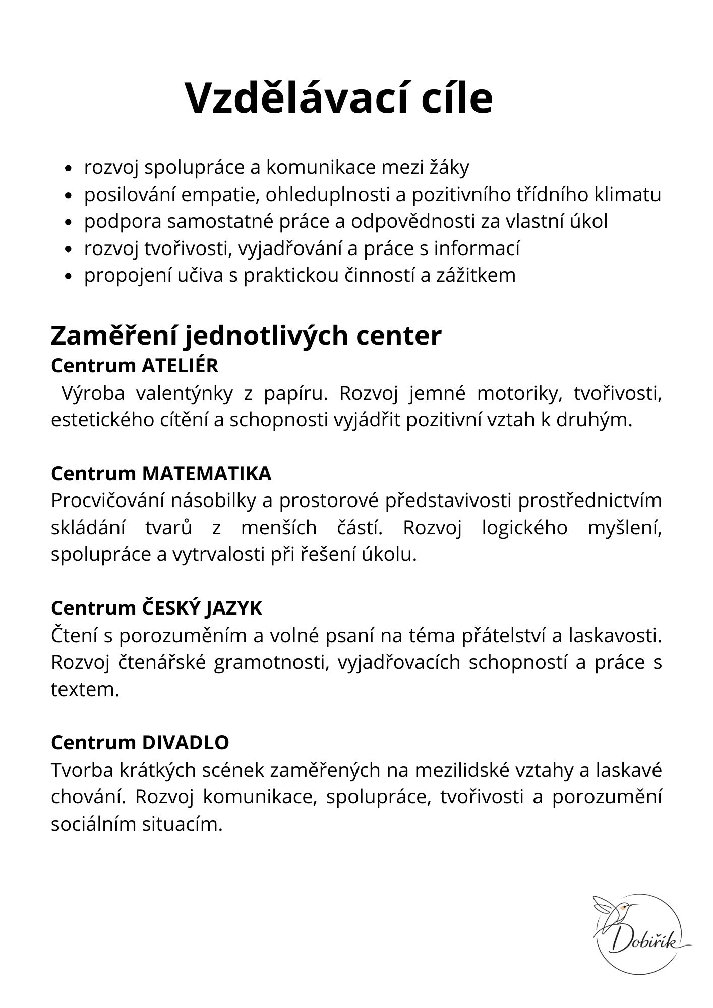 Tento materiál nabízí soubor čtyř center aktivit pro žáky 3. - 5. tříd základní školy s tematickým zaměřením na Valentýn – přátelství, laskavost a pozitivní vztahy mezi lidmi. Aktivity jsou navrženy tak, aby podporovaly spolupráci, samostatnost žáků a rozvoj klíčových dovedností napříč vzdělávacími oblastmi (jazyk, matematika, tvořivost i drama).