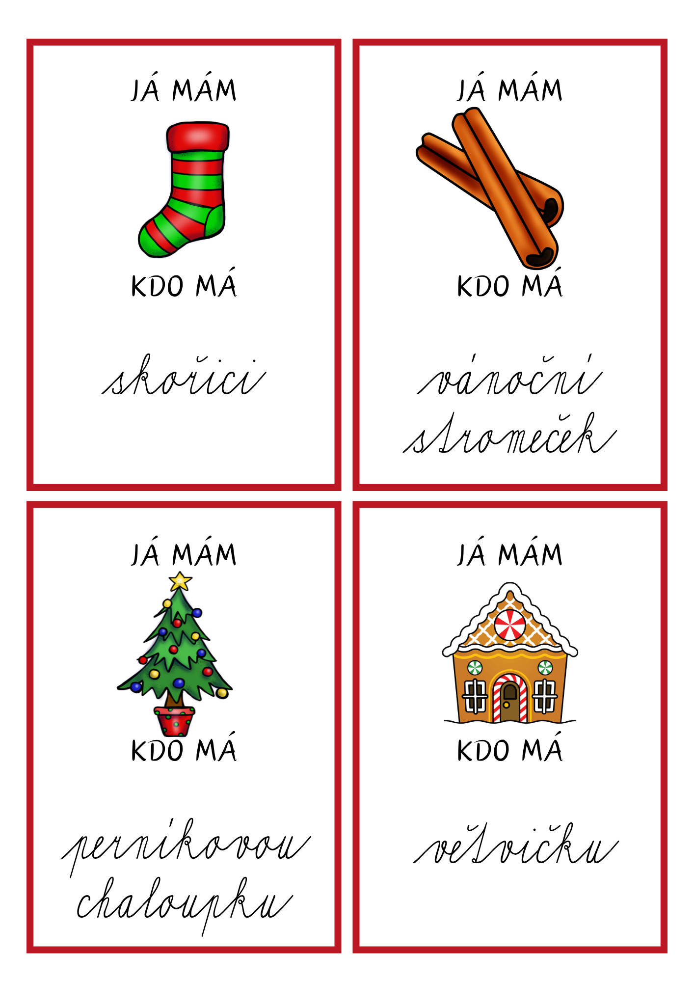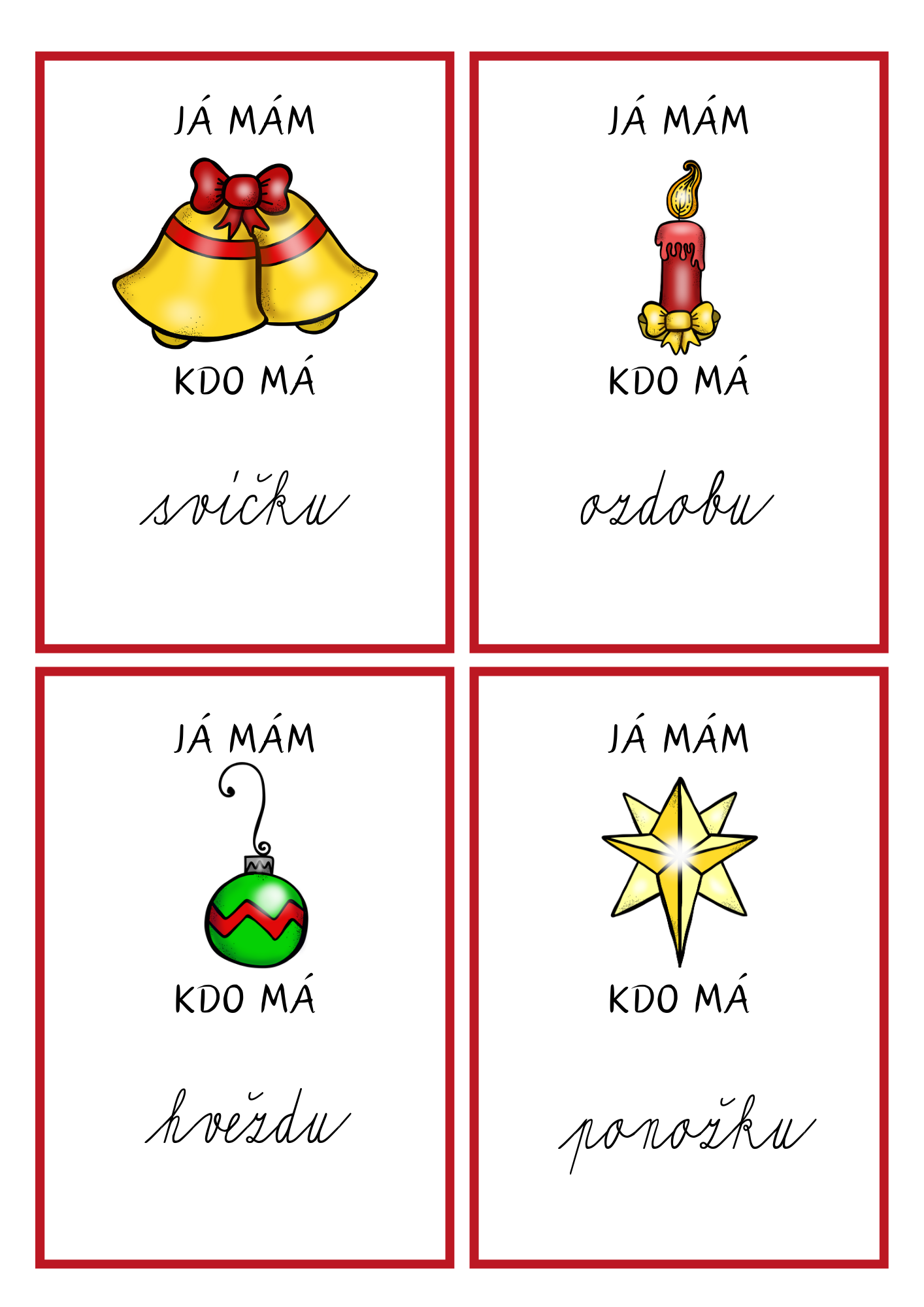 Tato vánoční hra skvěle procvičí čtení, porozumění textu a spojení obrázku se slovem. Děti čtou, hledají navazující kartu a spolupracují ve skupině. Aktivita podporuje pozornost, plynulost čtení i komunikaci a je ideální pro 2.–3. třídu.