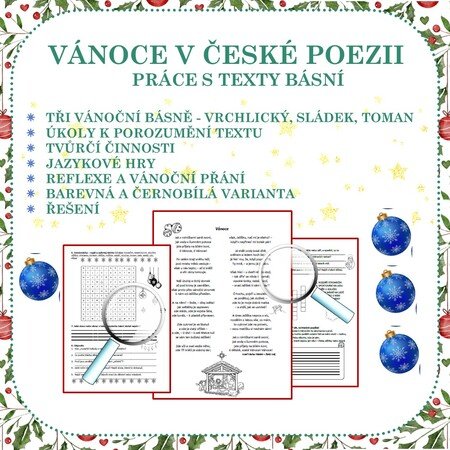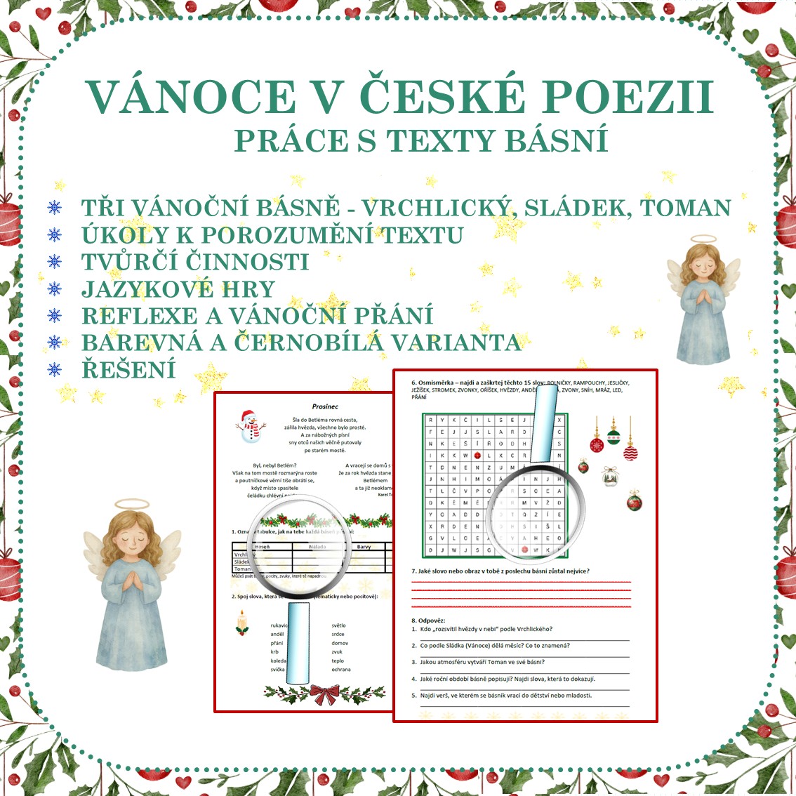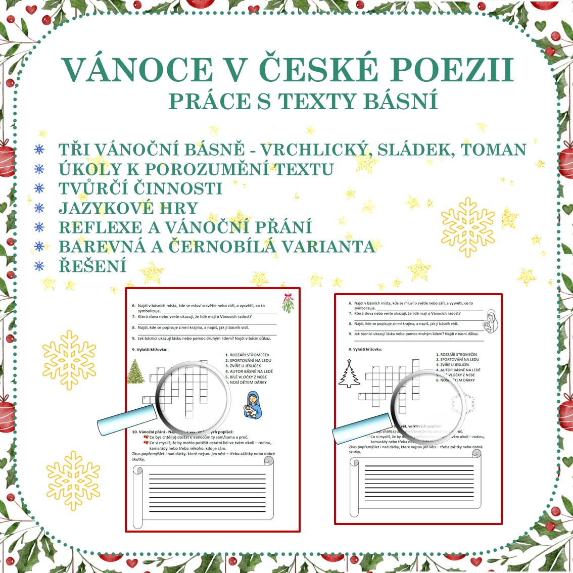 Pracovní listy nabízí žákům možnost pracovat s náladou, obrazností, barvami a zvuky. Úkoly je vedou k hledání zimních motivů, světla, radosti i lásky v básních. Součástí je také tvorba vlastního krátkého verše, kresba vystihující atmosféru textu a odlehčené aktivity, jako jsou osmisměrka a křížovka. Nechybí ani závěrečná reflexe formou vánočního přání.