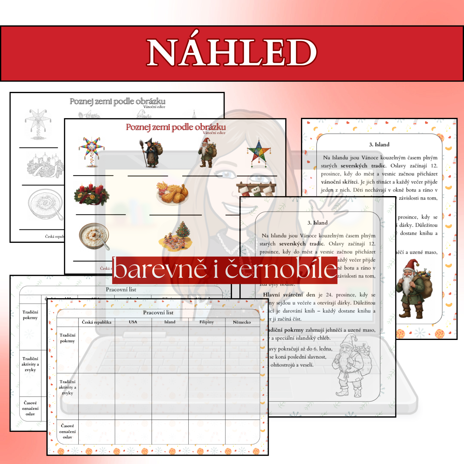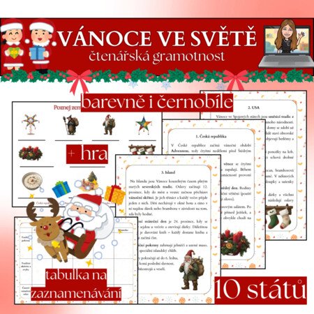 10 textů (kartiček) s informacemi o oslavě Vánoc (v ČR, USA, Německu, Mexiku, Japonsku, Itálii, Austrálii, ve Švédsku, na Islandu a Filipínách) ve velikosti A5.