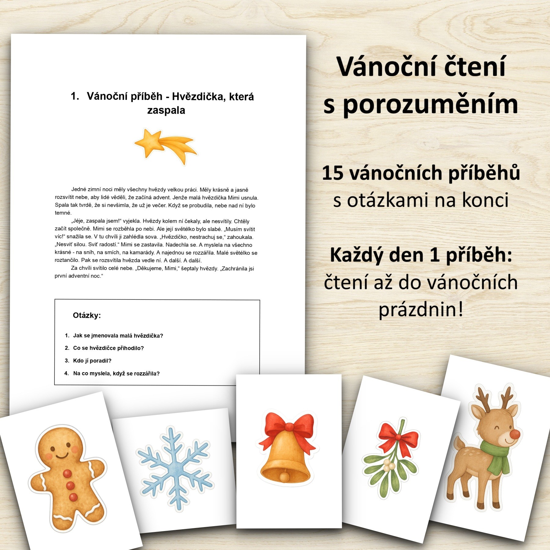 Soubor obsahuje 15 krátkých vánočních příběhů s otázkami na konci, ideálních pro každodenní čtení až do vánočních prázdnin (pro rok 2025)