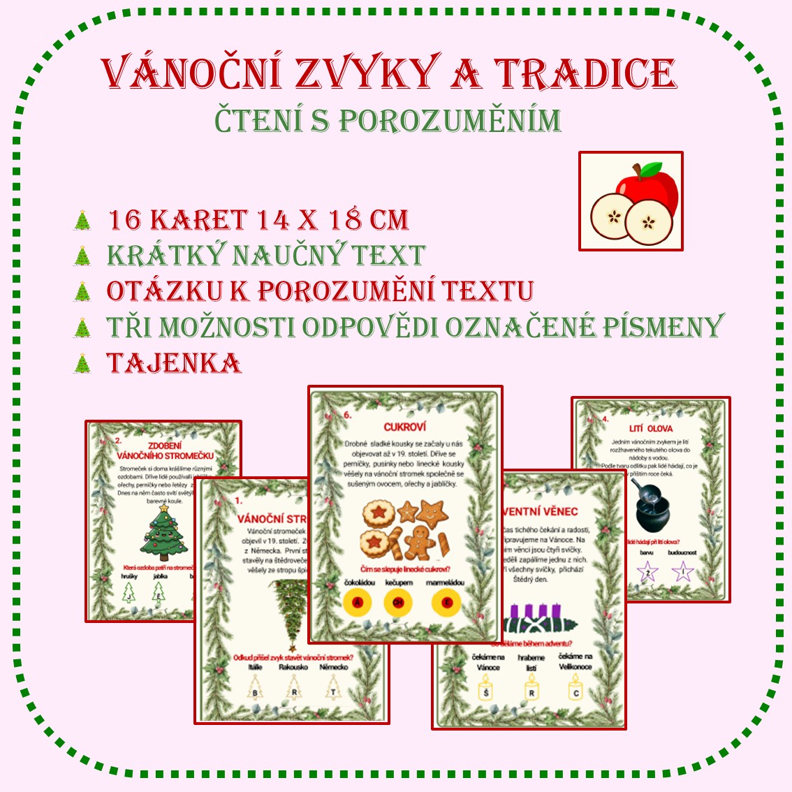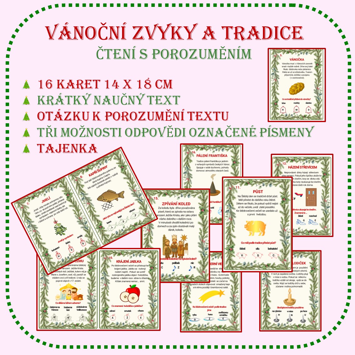 Materiál obsahuje karty s texty o vánočních zvycích a tradicích (např. vánoční stromeček, adventní věnec, jmelí, cukroví, vánoční večeře, koledy apod.).