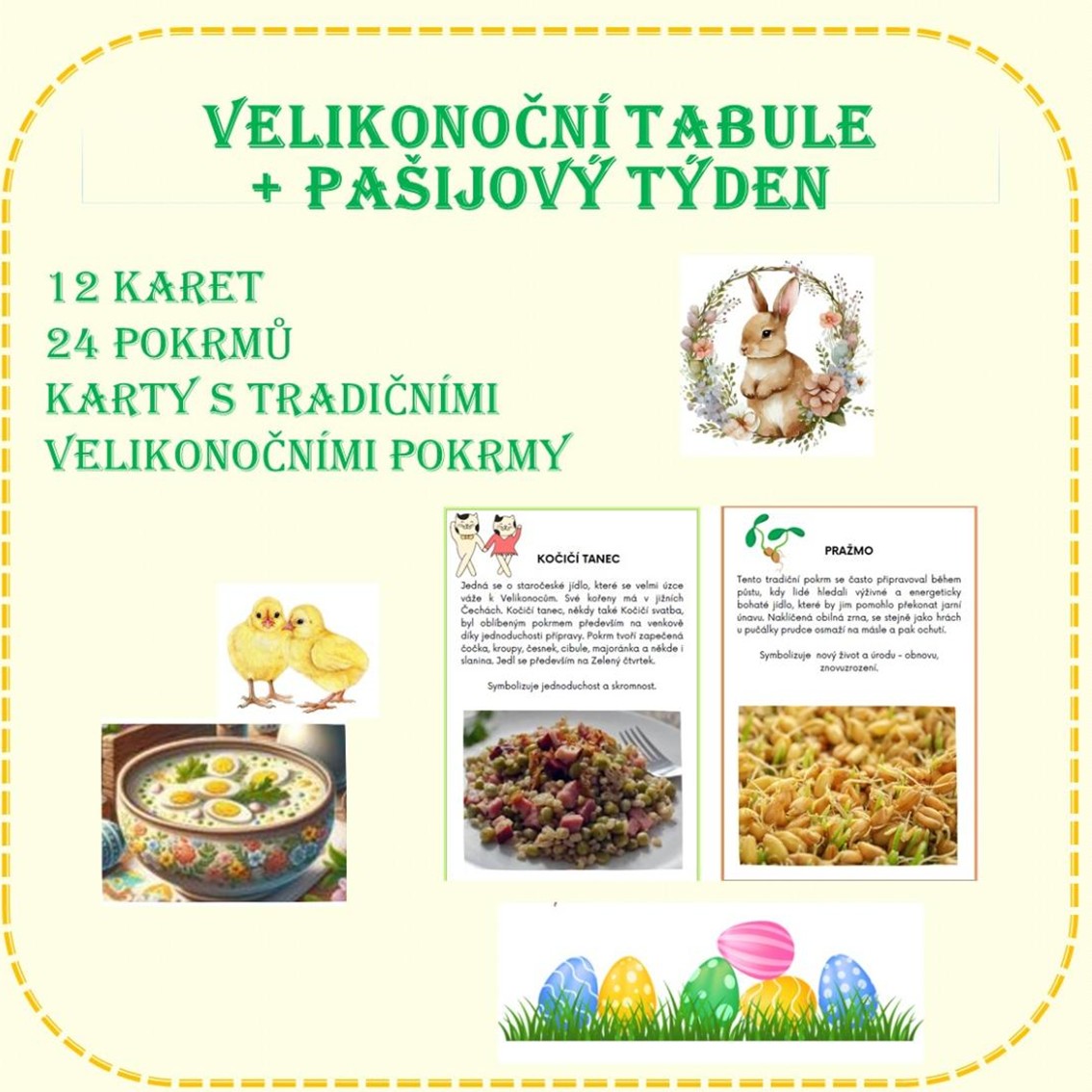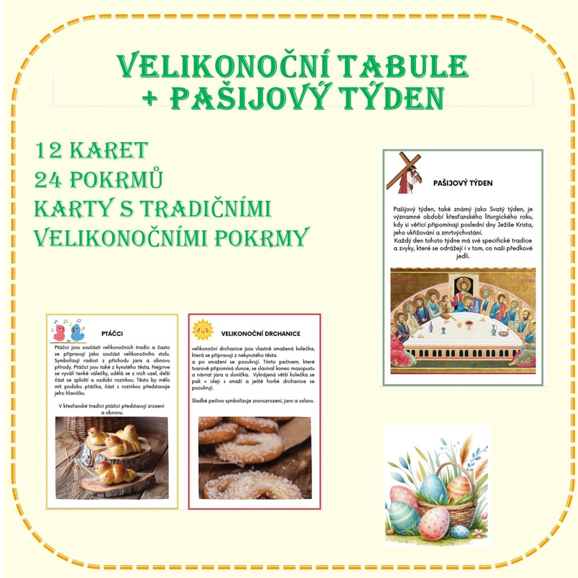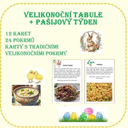 12 karet s 24 obrázky a pokrmy staročeské kuchyně, které se vztahují k období Velikonoc a celému pašijovému týdni. Karty můžete využít tehdy, když si s dětmi připomínáte velikonoční tradice.