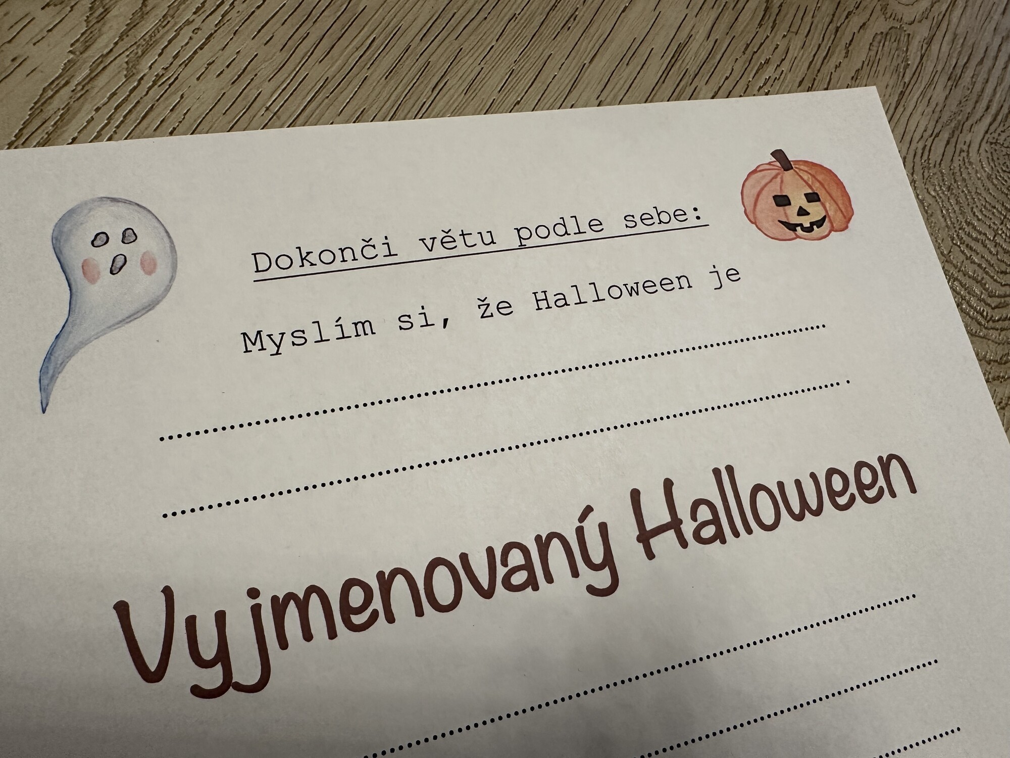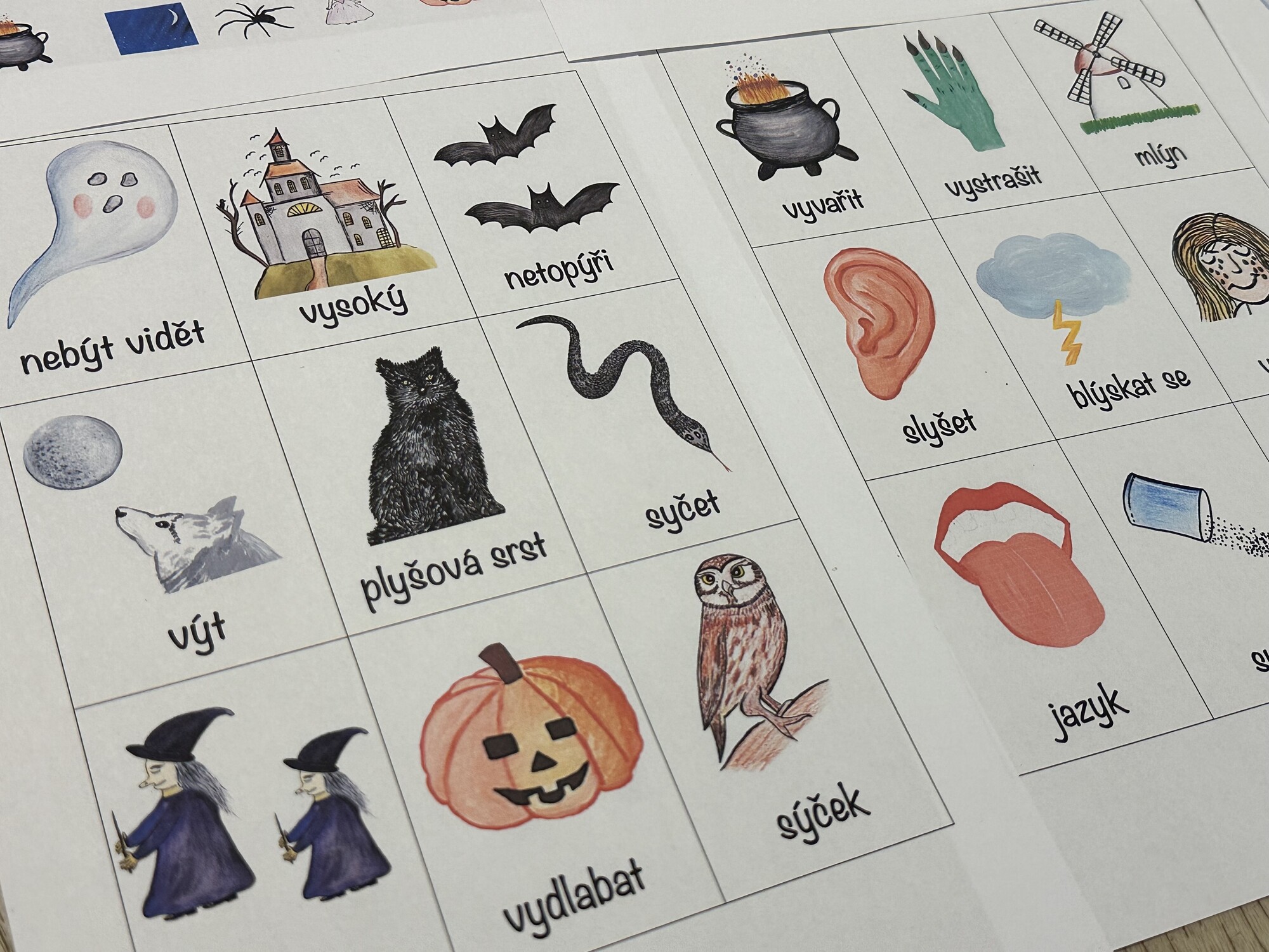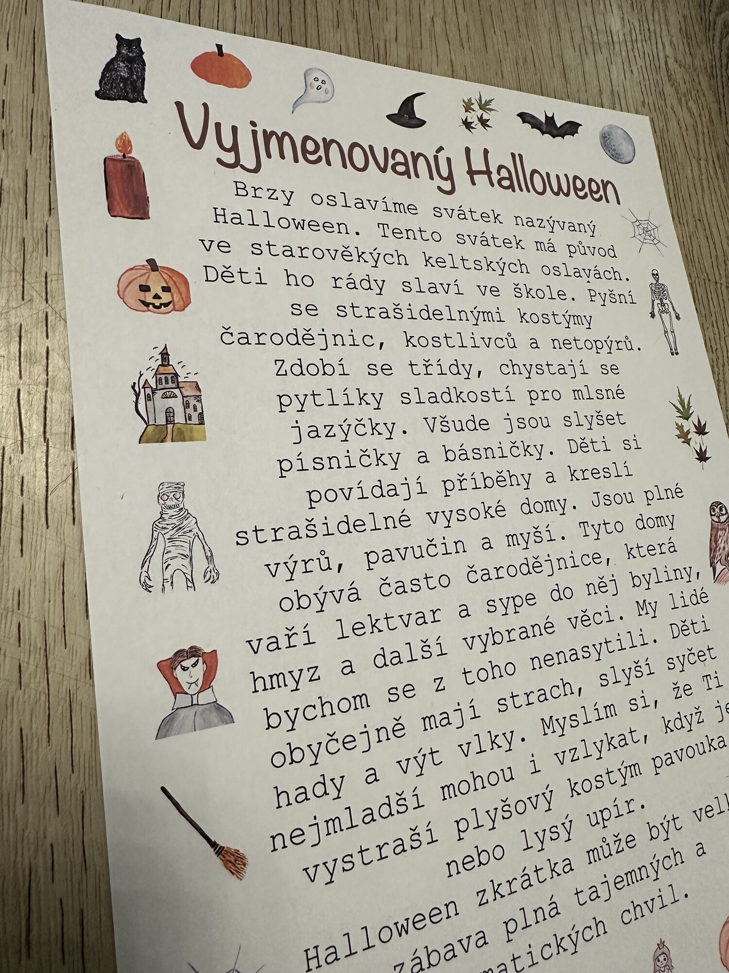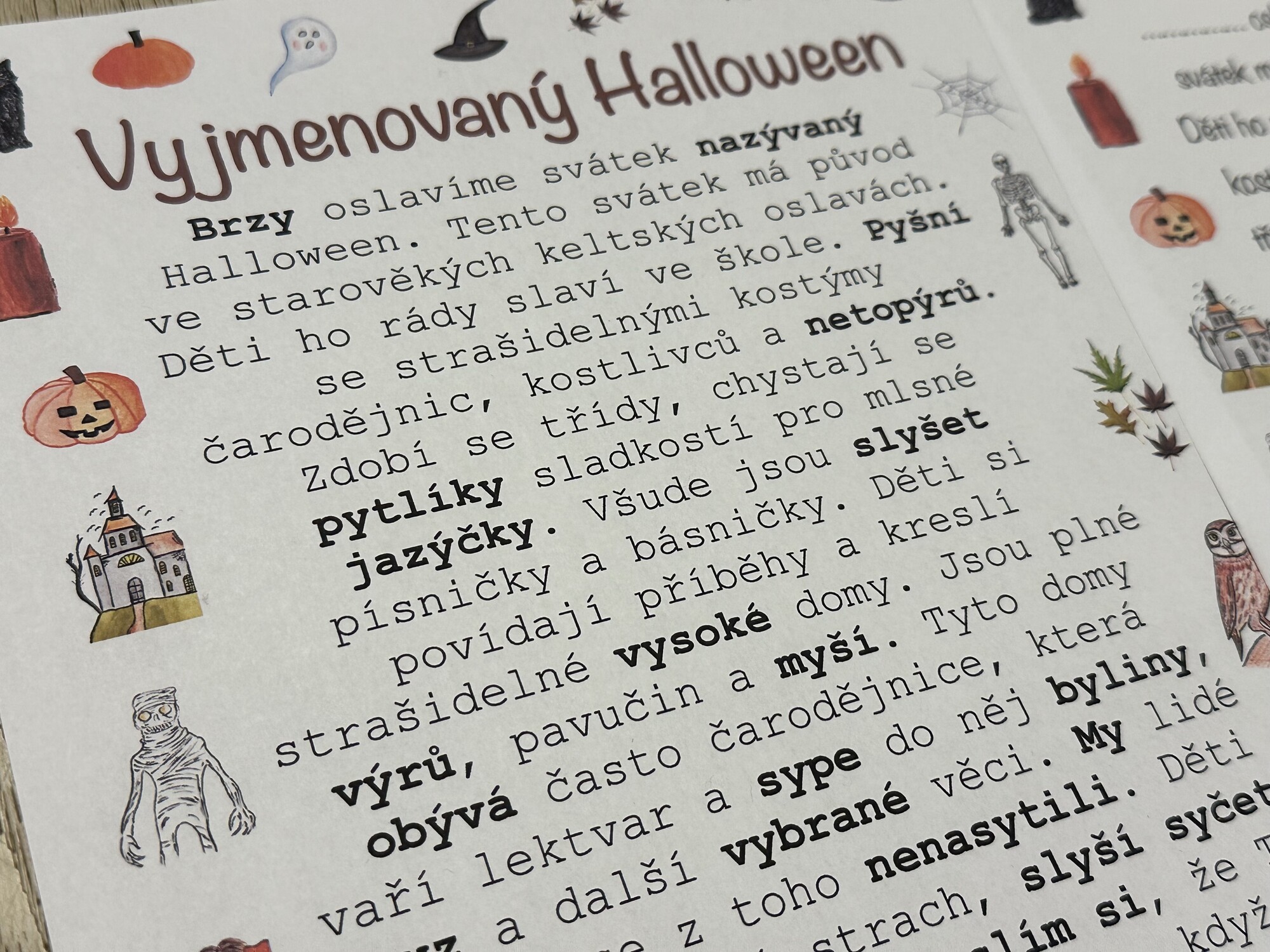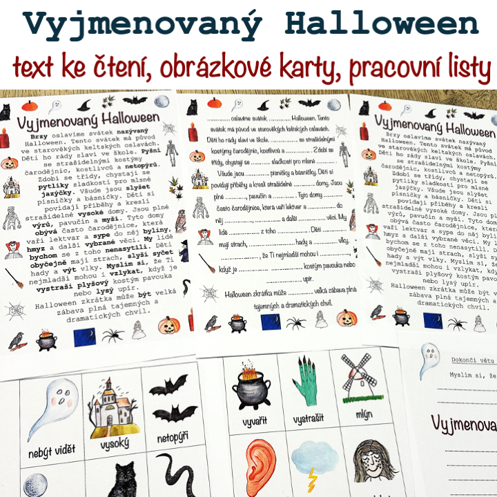 Materiál obsahuje 6 A4 stran – text Vyjmenovaný Halloween, text Vyjmenovaný Halloween s vyznačenými vyjmenovanými slovy, pracovní list k doplnění slov, pracovní list určený k dokončení věty a k psaní vlastního textu vyjmenovaný Halloween, 18 obrázkových karet – inspirace k psaní vlastního textu.