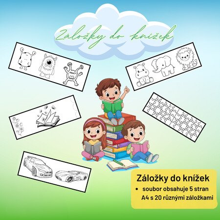 📚 soubor obsahuje 5 stran A4 s 20 různými záložkami, které si děti mohou vybarvit.