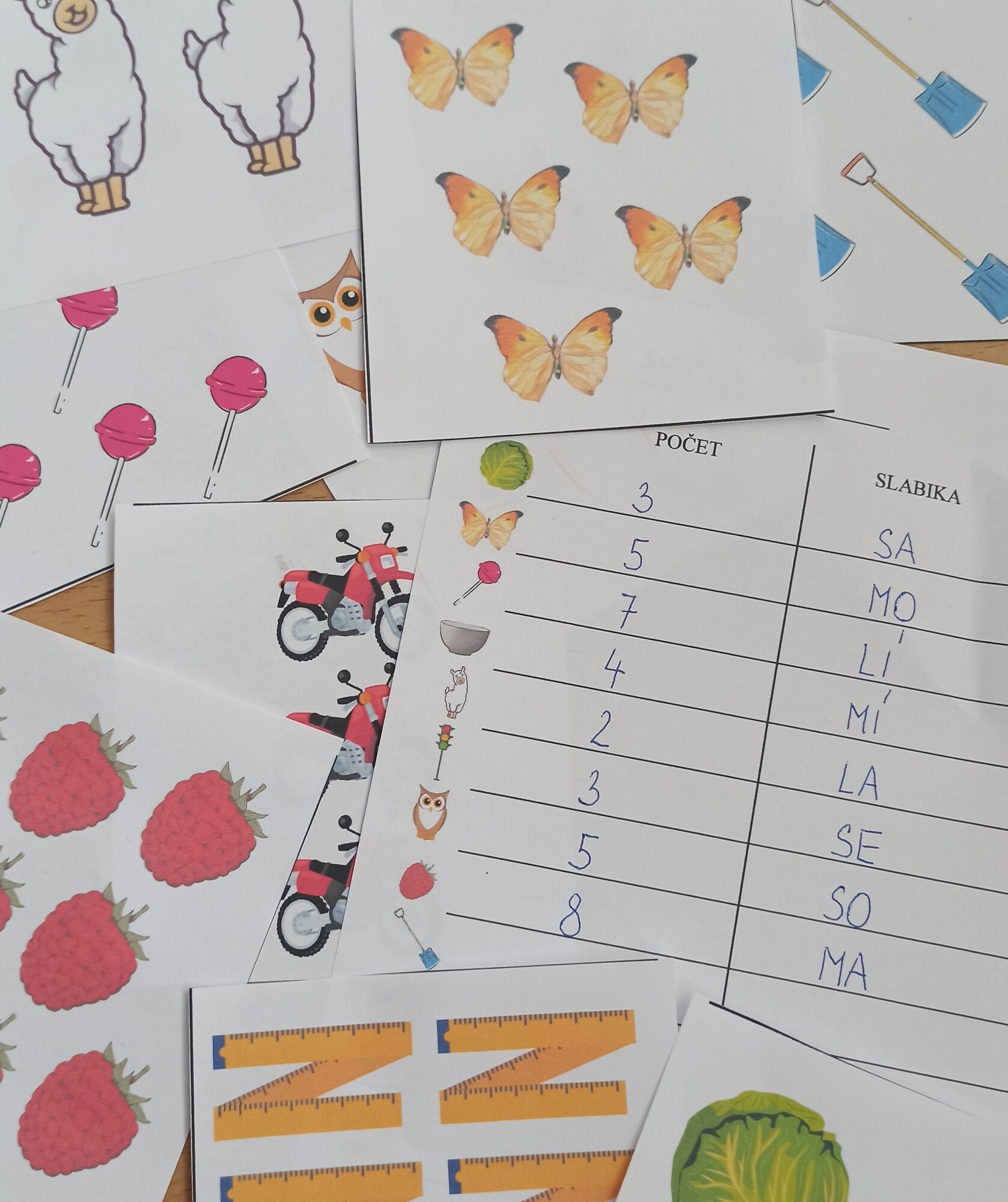 Děti mají za úkol pohybovat se s pracovním listem po prostoru a zapisovat si k obrázkům jejich počet (mohou dělat čárky, puntíky nebo psát čísla) a 1) počáteční písmeno nebo 2) počáteční slabiku obrázků.