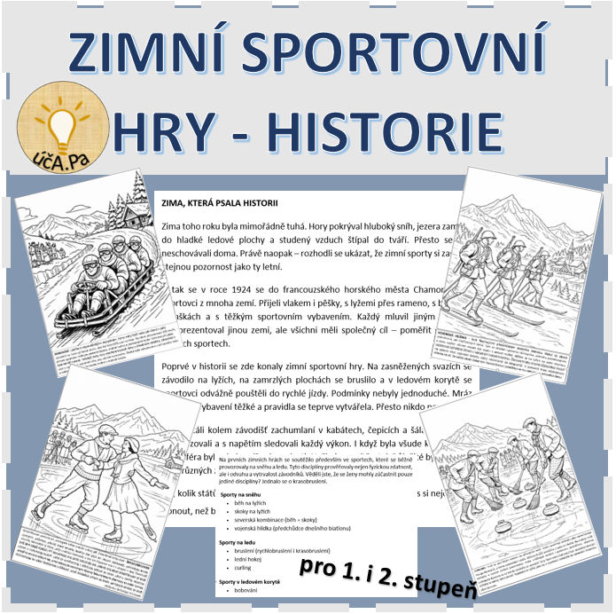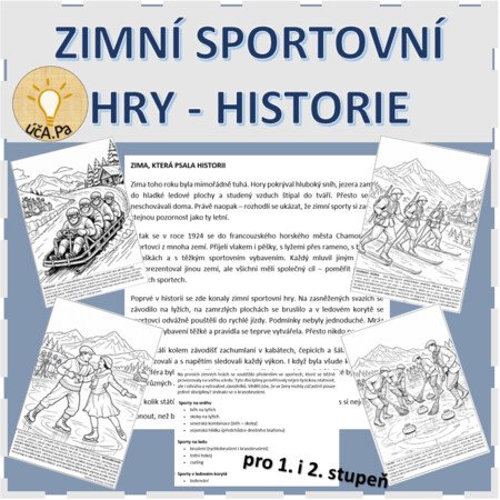 Cílem materiálu je seznámit žáky s historií prvních zimních sportovních her v Chamonix 1924 prostřednictvím textu a omalovánek. Žáci si osvojí základní fakta o tehdejších sportech, můžou porovnat vybavení s dneškem a rozvinout svůj zájem o historii a sport.