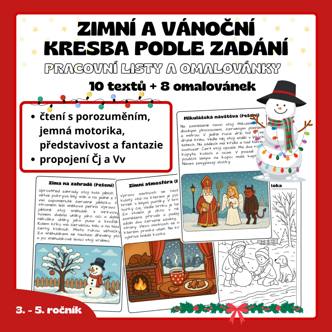Kreslete podle zadání zimní, adventní a vánoční obrázky. Materiál obsahuje 10 textů a k nim 8 originálních omalovánek. Podpoříte schopnost porozumět textu, jemnou motoriku, představivost a fantazii. Vhodné do Čj, Vv i třídnických hodin.