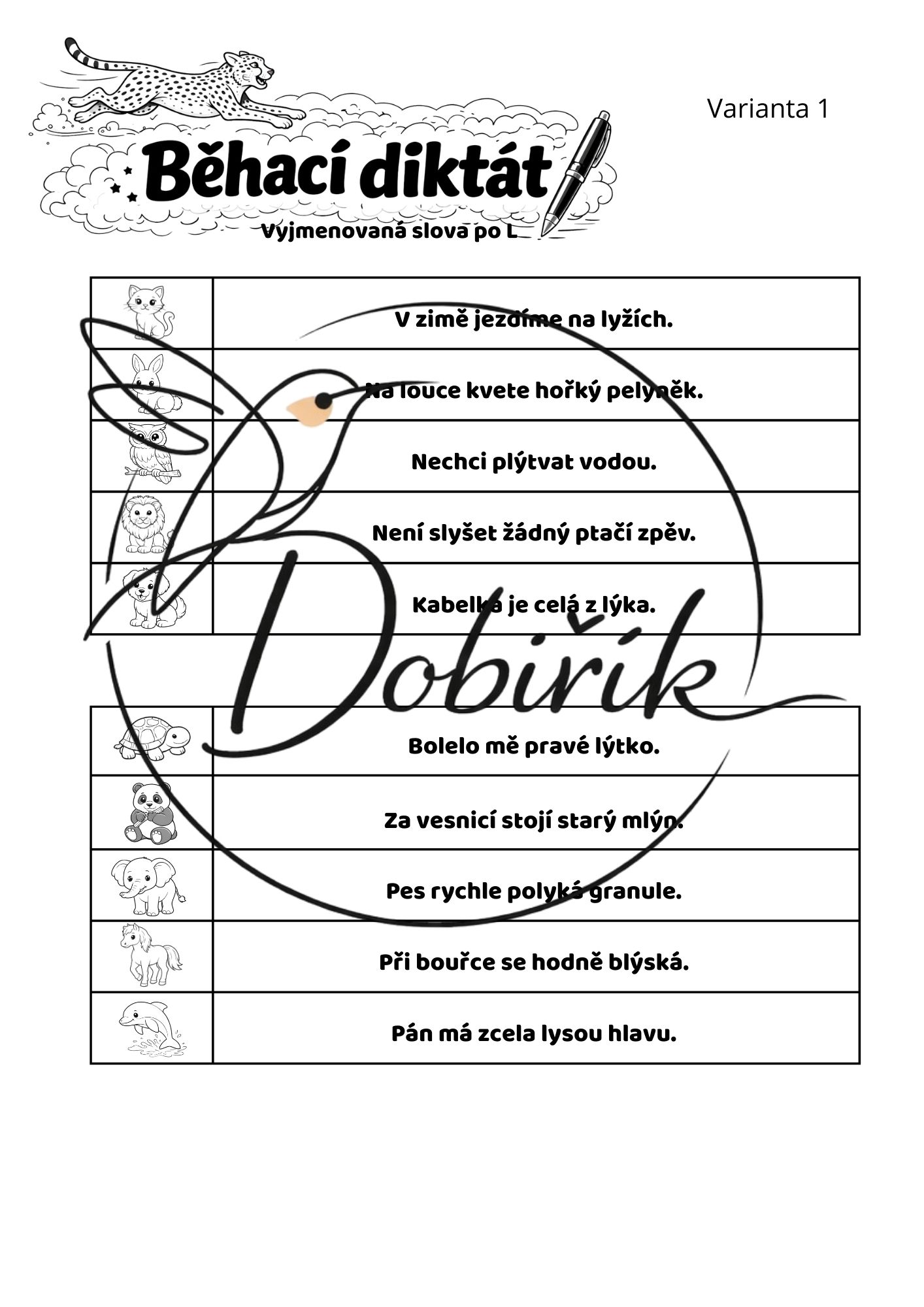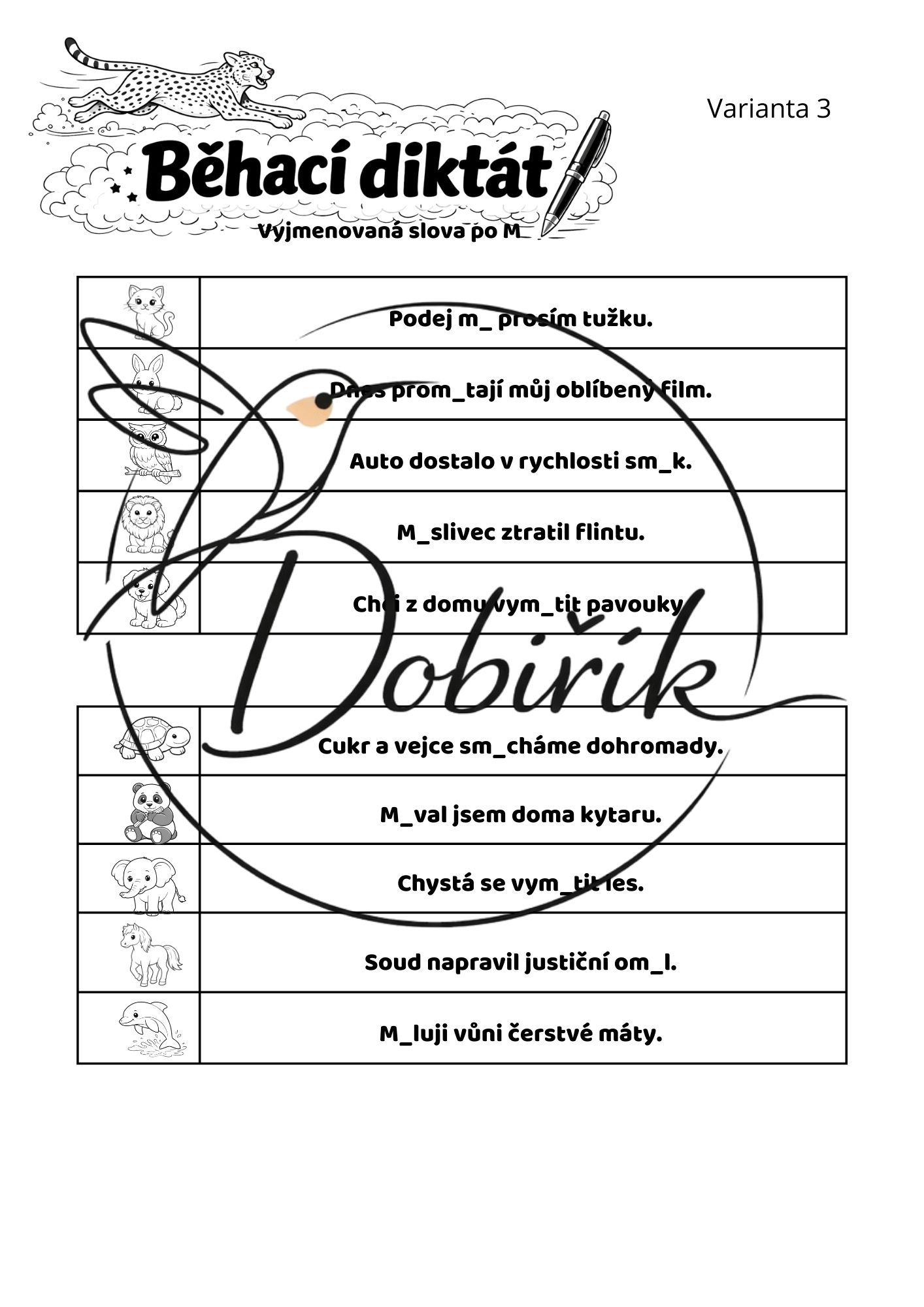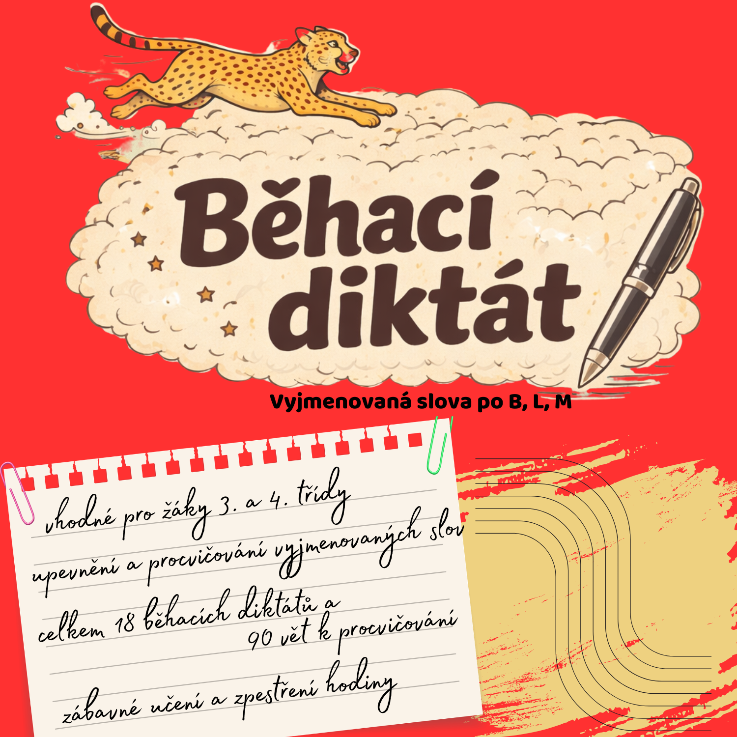 Soubor obsahuje 18 běhacích diktátů a celkem je připraveno 90 vět k procvičení vyjmenovaných slov po B, L, M. Jednotlivé pracovní listy jsou zpracovány ve třech variantách obtížnosti – zaměřují se na samotná vyjmenovaná slova, slova odvozená, příbuzná a také na chytáky.