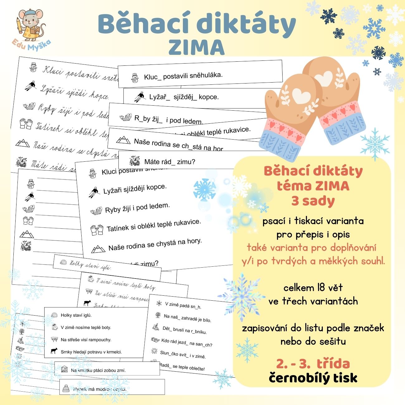 Soubor obsahuje tři sady běhacích diktátů / vět určených k opisu, přepisu nebo přepisu s doplňováním y/i.