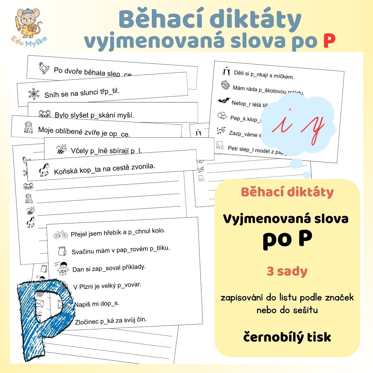 Soubor obsahuje tři sady běhacích diktátů / vět určených k přepisu a doplnění správného I/Y po P.