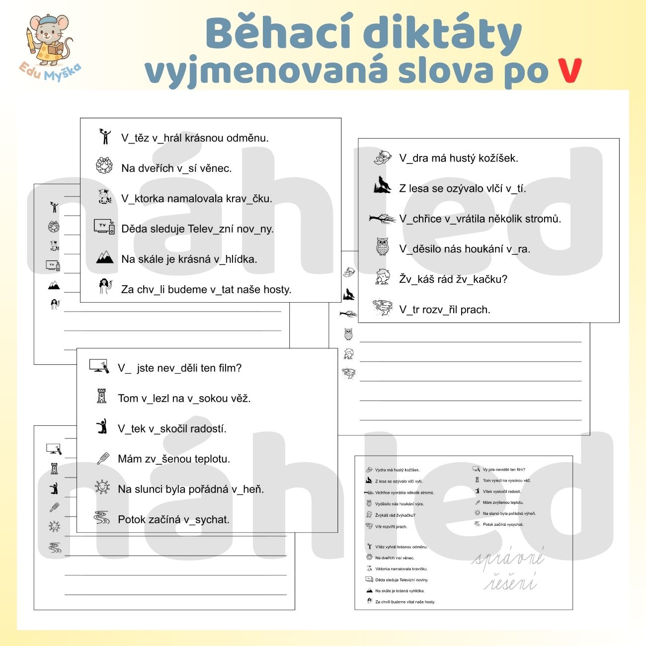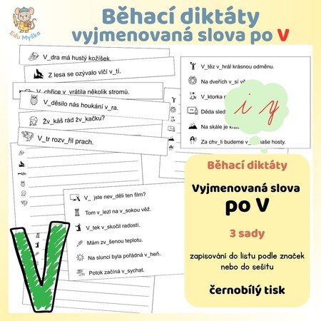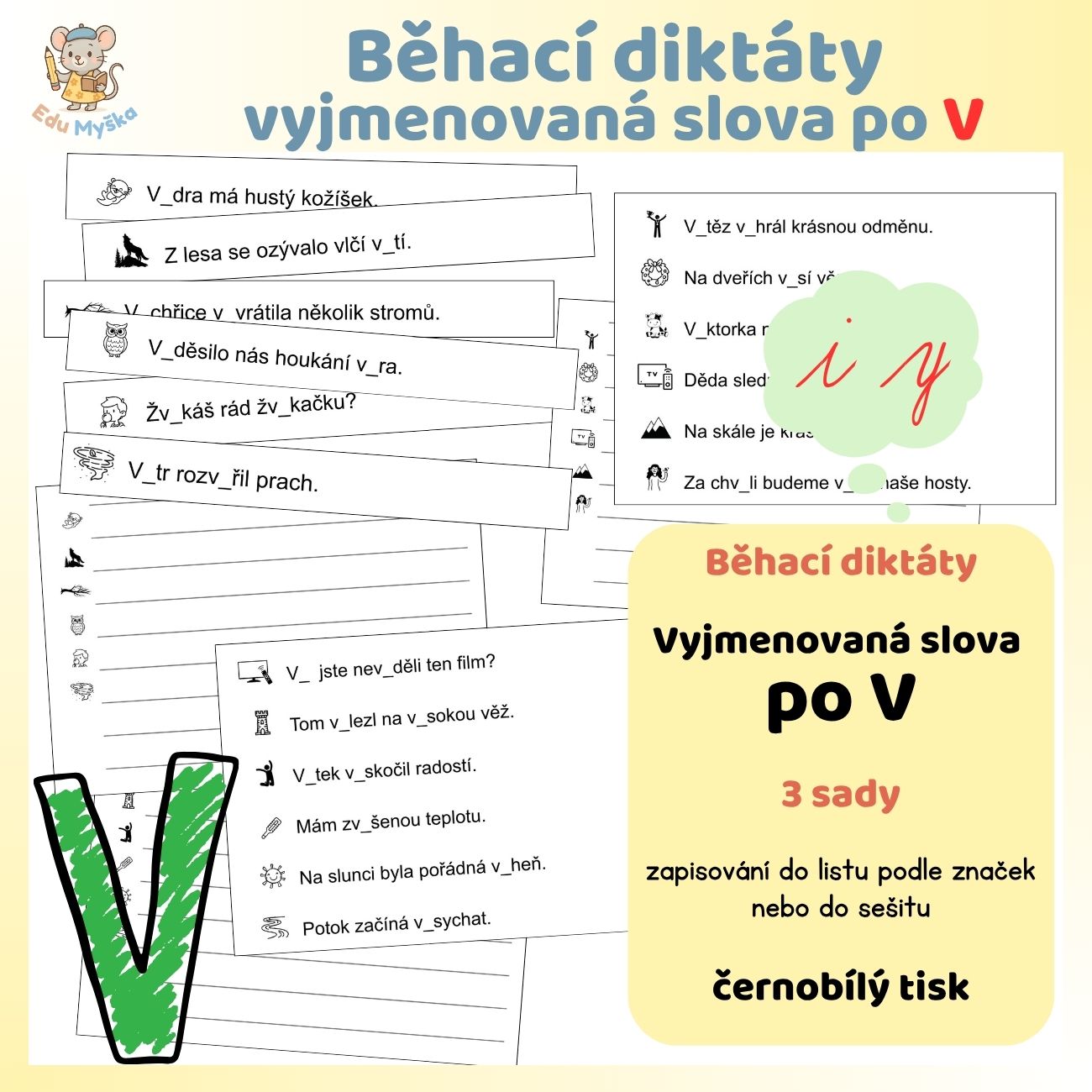 Soubor obsahuje tři sady běhacích diktátů / vět určených k přepisu a doplnění správného I/Y po V.