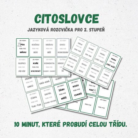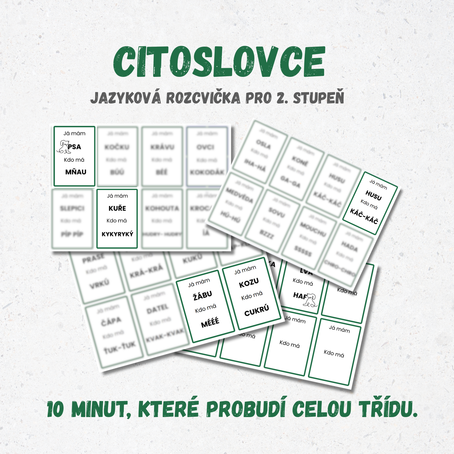 Materiál Citoslovce – jazyková rozcvička pro 2. stupeň je krátká aktivizační hra typu „Já mám, kdo má“, zaměřená na procvičení a upevnění citoslovcí zvířat. Je určen pro žáky