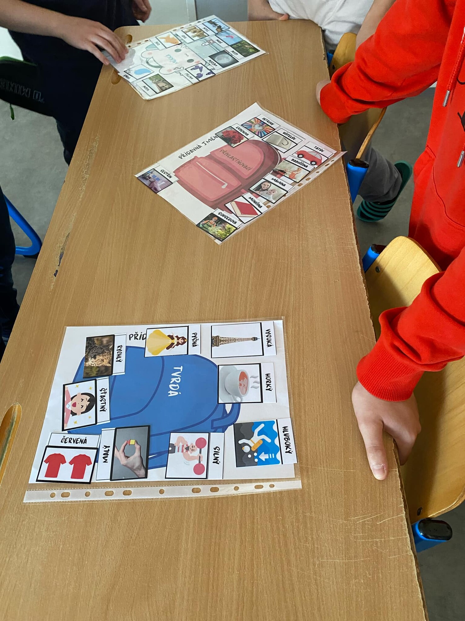9 stran/karet s obrázky i bez obrázků. Od každého druhu je zde uvedeno 18 přídavných jmen, celkem 54, které žáci přiřazují do „školních aktovek“.