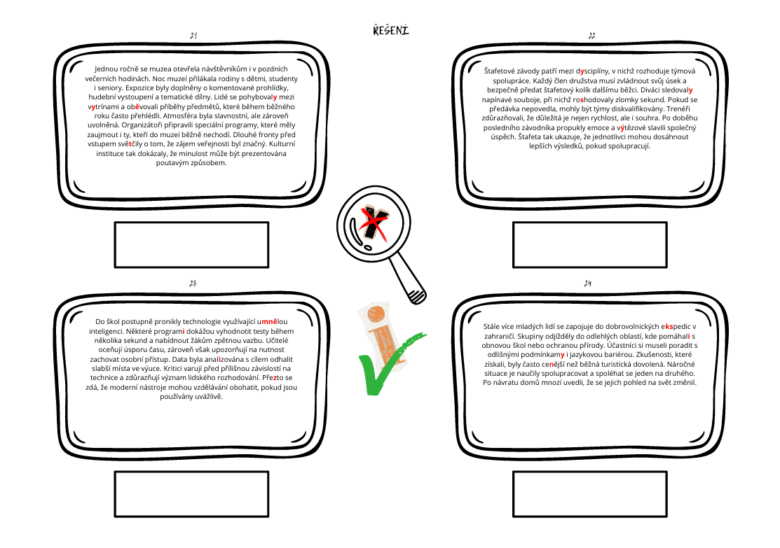 V každém textu žáci hledají 4 pravopisné chyby, slova následně zapisují správně. Úlohy odpovídají typovým cvičením z didaktických testů.