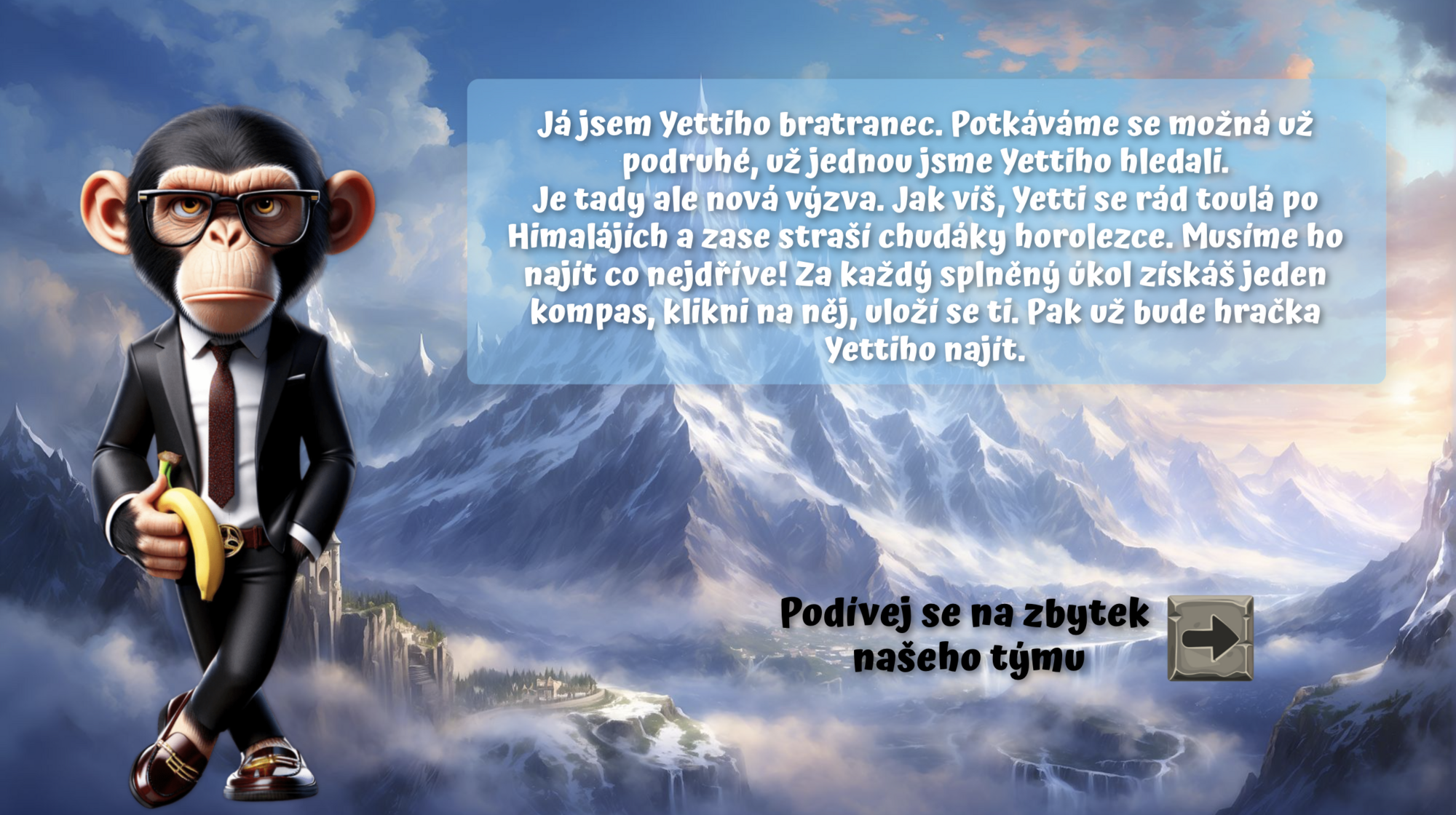 Příběh - opičí rodina vyrazila do Himalájí hledat svého rodinného příslušníka - Yettiho, který tam straší horolezce. Za každý splněný úkol získá žák jiný kompas a kód, který dovede až k nalezení Yettiho. Na začátku hry se žák seznámí s celou skupinou a pak už hraje.