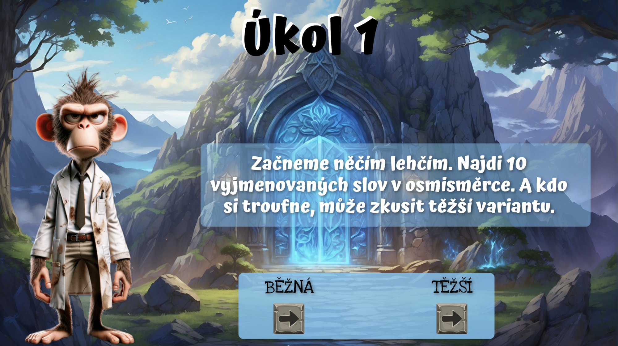 10 vyjmenovaných slov skrytých v osmisměrce. Na výběr jsou dvě varianty. Běžná má rozměr 10x10 políček a těžší 15x15 políček. Rozmístění slov je u každého žáka náhodné. Po splnění běžné varianty je volitelně možné zkusit i těžší. Po splnění se pokračuje kliknutím na postavu opice.
