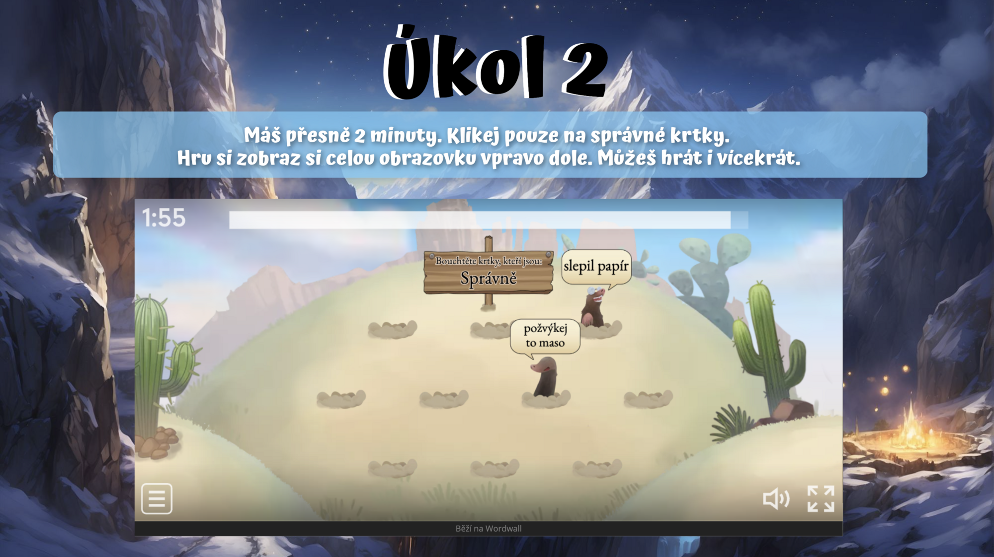Vložena hra z aplikace Wordwall, ve které žák musí klikat na všechny krtky, u kterých jsou správně napsané výrazy vyjmenovaných slov. Celkem 15 správných a 15 nesprávných výrazů, časový limit je 2 minuty. Po skončení žák klikne na šipku - ta se objeví po 60s. Hra se dá zobrazit i na celou obrazovku.