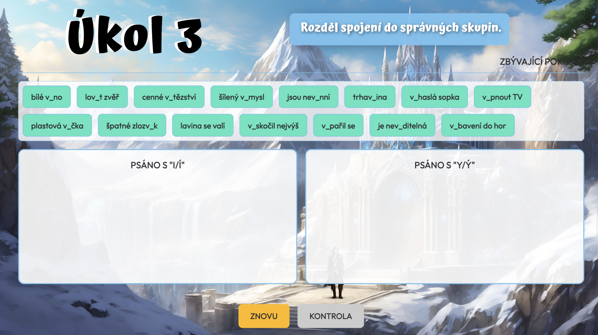 Žák rozřazuje výrazy do dvou skupin. Celkem 45 výrazů rozdělených do 3 samostatných cvičení (podle písmen P, S, V). Špatně umístěné prvky se po kontrole vrátí na původní místo.